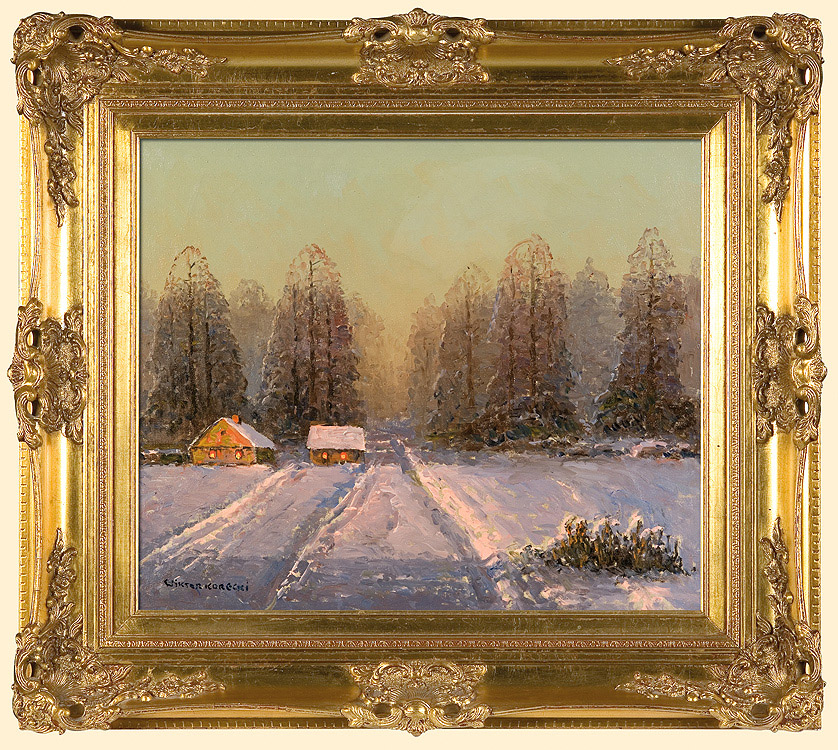 Wiktor Korecki (Kamieniec Podolski 1890 - Komorów k. Warszawy 1980) - malarz pejzażysta - gimnazjum ukończył w Kijowie, tam też studiował w Szkole Rysunkowej Aleksandra Muraszki. Po studiach wrócił do Kamieńca Podolskiego, skąd w roku 1921 wyjechał do Warszawy. Tu miał pracownię na rogu ulic Tamki i Cichej. Niestety zgromadzone tam obrazy spłonęły w czasie powstania 1944 roku. Po powstaniu artysta przebywał w obozie w Pruszkowie skąd trafił do obozu pracy w Lipsku. Do kraju powrócił w roku 1946 i zamieszkał w Komorowie pod Warszawą, a później w Milanówku. Jego nastrojowe krajobrazy emanujące spokojem i pogodą cieszyły się zawsze dużą popularnością. Korecki najczęściej malował pejzaże zimowe z motywem leśnej drogi i strumienia wijącego się wśród śniegów, a obok nich także wiosenne, letnie czy jesienne widoki z Mazowsza.