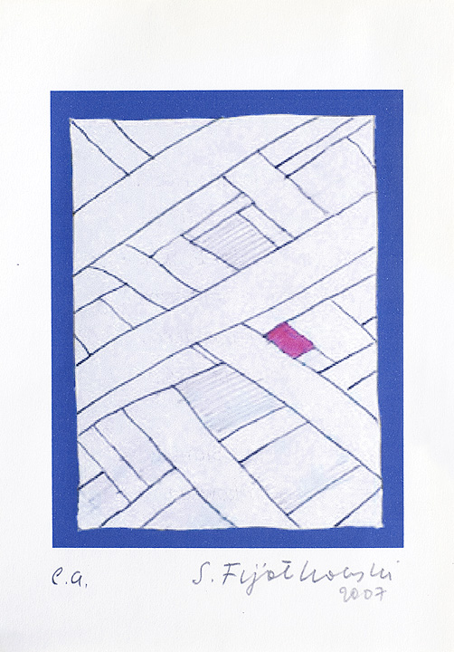 Stanisław Fijałkowski (Zdołbunow na Wołyniu 1922 - Łódź 2020) w latach 1944-1945 przebywał na robotach przymusowych w Królewcu. W latach 1946- 1951 studiował w Państwowej Wyższej Szkole Sztuk Plastycznych w Łodzi pod kierunkiem Władysława Strzemińskiego, Stefana Wegnera i Ludwika Tyrowicza, u którego uzyskał dyplom. W latach 1947-1993 był pedagogiem w macierzystej uczelni, od 1983 profesorem. Pełnił funkcje prorektora i dziekana Wydziału Grafiki. Wykładał też za granicą: w Mons (1978, 1982), Giessen (1989-1990), Marburgu (1990). Jest wiceprezydentem Międzynarodowego Stowarzyszenia Drzeworytników XYLON w Szwajcarii i przewodniczącym Polskiej Sekcji tej organizacji. Należy do zagranicznych Akademii nauk i sztuk w Salzburgu i Brukseli. Jest laureatem Nagrody Krytyki Artystycznej im. Cypriana Norwida 1971, Nagrody im. Jana Cybisa 1990 i wielu innych wyróżnień. Jako pierwszy w Polsce przetłumaczył teksty Wasyla Kandinskiego („Punkt i linia a płaszczyzna” i „O duchowości w sztuce”), oba wydane drukiem, oraz Kazimierza Malewicza „Świat bezprzedmiotowy”. Malarstwo Fijałkowskiego bazuje na skromnym zasobie abstrakcyjnych znaków i ograniczonej gamie barwnej. Kompozycje, w większości sugerujące ujęcia pejzażowe czy szerzej – przestrzenne, budowane są jakby pojedynczymi dotknięciami pędzla. Każdy szczegół nabiera ważności, śledzi się każdy niuans barwy czy faktury. Charakterystyczne kształty i motywy powtarzają się w różnych konfiguracjach w pracach artysty niczym wyrazy, z których układa za każdym razem inną opowieść. Obrazy noszą zazwyczaj poetyckie tytuły, często wpadające w tony groteskowe czy surealistyczne. Cechy te składają się na niezwykłe, intrygujące, autonomiczne zjawisko artystyczne. Malarstwu Fijałkowskiego od początku lat 60. towarzyszy czarno-biała grafika, głównie linoryt i drzeworyt, sporadycznie litografia.