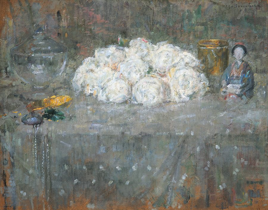 Olga Boznańska (Kraków 1865 - Paryż 1940) – wybitna malarka polska – kształciła się w Krakowie, początkowo pod kierunkiem matki, nauczycielki rysunków Eugenii Mondan, później u J. Siedleckiego, H. Lipińskiego, K. Pochwalskiego. W latach 1884-1886 uczęszczała także na Wyższe Kursy Artystyczne dla Kobiet przy Muzeum Techniczno-Przemysłowym. W 1886 wyjechała do Monachium gdzie uczyła się pod kierunkiem Karla Kricherdorfa i Wilhelma Dürra. Od 1889 pracowała samodzielnie i miała w Monachium własną pracownię. Od 1895 nauczała w prywatnej szkole malarstwa Theodora Humla. Z Monachium wielokrotnie jeździła do kraju, a także do Francji i Szwajcarii. W 1898 przeniosła się na stałe do Paryża, gdzie – przez lata – była jedną z czołowych postaci polskiej kolonii artystycznej. Debiutowała w roku 1886 na wystawie w krakowskim Towarzystwie Przyjaciół Sztuk Pięknych i odtąd stale uczestniczyła w wystawach krajowych i zagranicznych, zdobywając medale i wyróżnienia. W roku 1910 otrzymała francuską Legię Honorową, w roku 1938 order Polonia Restituta. Należała do wielu znaczących – polskich i europejskich – stowarzyszeń artystycznych. Główną domeną jej twórczości był portret – we wcześniejszym, monachijskim okresie często cało postaciowy, monumentalny i zwarty w formie; w czasach paryskich bardziej kameralny, nastrojowy, o zróżnicowanych walorowo plamach barwnych podporządkowanych dominacji jednego tonu, gubiących kontury i zacierających ostrość planów. Malowała też martwe natury i – rzadziej – pejzaże miejskie czy kompozycje rodzajowe.