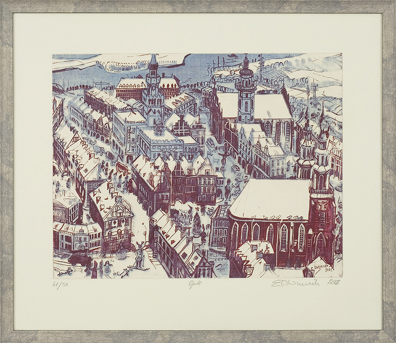 Edward Dwurnik (Radzymin 19 IV 1943 - Warszawa 28 X 2018) studiował malarstwo w ASP w Warszawie (1963-1970), jednak jako swego „mistrza“ wymienia Nikifora. Jego to prace, zobaczone po raz pierwszy w 1965, zainspirowały ówczesnego studenta III roku do narysowania pierwszych prac z cyklu „Podróże autostopem“, które kontynuował w nastepnych latach. W 1972-1978 powstawał cykl „Sportowcy“, w którym portretowane były, dodajmy - kąśliwie, typowe postaci z lat 70. Równolegle od 1975 powstawał cykl „Robotnicy“, który kulminował w okresie „Solidarności“ 1980-1981. Za prace z tego cyklu Dwurnik otrzymał w 1981 Nagrodę Krytyki Artystycznej im. Cypriana Kamila Norwida, natomiast za obrazy z cyklu „Warszawa“ (1981), proroczo zapowiadające stan wojenny - Nagrodę Kulturalną „Solidarności“ podziemnej w 1983. W latach 80. malarstwo Dwurnika przybrało wyraz ekspresyjny i dramatyczny. Powstające w tej dekadzie obrazy miały niejednokrotnie wymowę polityczną, przybierały też kostium historyczny, tak czy inaczej odnoszący się do współczesnych spraw i realiów. Cykl „Droga na Wschód“ (1989-91) upamiętniał ofiary stalinizmu, natomiast cykl „Od Grudnia do Czerwca“ (1990-94) - ofiary stanu wojennego. Zarówno ideowe, jak i czysto malarskie walory tych prac przyniosły artyście ogromne uznanie, zarówno w kraju jak i za granicą. Jego wyrazem była prestiżowa nagroda Fundacji Coutts & Co w Zurychu (1992). W latach 90. powstają cykle będące kontynuacją „Podróży autostopem“: „Niebieskie miasta“ (od 1993) i „Diagonale“ (od 1996), jak również kompozycje nowego typu, jak widoki morskie (cykl „Błękitne“, 1992-93) czy cykl „Wyliczanka“ (1996-99). Artysta wiele wystawia, miał ok. 100 wystaw indywidualnych w Polsce i za granicą, brał też udział w licznych wystawach i festiwalach krajowych i międzynarodowych, m.in.: X Biennale Sztuki Współczesnej, Menton 1974, Documenta 7, Kassel 1982, 5th Biennale, Sydney 1985, XIX Biennale Sztuki, Sao Paulo 1987; Olimpiada Sztuki, Seul 1988. Równolegle z malarstwem uprawiał rysunek, collage, grafikę warsztatową (litografia, techniki metalowe, kserografia, stemple) i użytkową (ilustracja, plakaty do własnych wystaw indywidualnych).