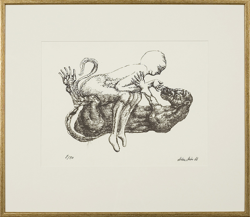 Jan Lebenstein (Brześć Litewski 1930 - Kraków 1999) w latach 1948-1954 studiował malarstwo w ASP w Warszawie pod kierunkiem prof. Eugeniusza Eibischa i Artura Nachta-Samborskiego. W 1955 wziął udział w wystawie w warszawskim Arsenale. Zaprzyjaźniony w czasie studiów z Mironem Białoszewskim, swą pierwszą wystawę indywidualną pokazał w 1956 w Teatrze na Tarczyńskiej. W 1959 zdobył Grand Prix de la Ville de Paris na I Biennale Młodych w Paryżu i w tym roku przeniósł się na stałe do Paryża. Po seriach "figur kreślonych" (na papierze milimetrowym) i "figur hieratycznych" z lat 1955-1958 maluje cykl "figur osiowych" (1958-1962), które wystawia w Paryżu i USA. Równolegle w 1960 zaczyna rysowane "karnety", rodzaj dziennika, który w przyszłości dostarczy motywów wykorzystanych w obrazach. W latach 1964-1965 maluje "Bestiarium", cykl fakturowych, archaizowanych stworów przypominających prehistoryczne wykopaliska. Bezpośrednio po nich wprowadza do swych obrazów postaci ludzkie i fantastyczne, odgrywające sceny ni to mitologiczne, ni to ze snu, często przesycone erotyką. W 1970 projektuje witraże dla Centre du Dialogue w Paryżu. W W 1971 otrzymuje obywatelstwo francuskie 1974 powstają gwasze inspirowane Folwarkiem zwierzęcym George'a Orwella. W latach 1976-1989 tworzy wyłącznie w technice gwaszu i pastelu, podejmując tematykę mitologiczną i zaczerpniętą z Biblii: cykle ilustracji do Księgi Hioba (wyd. 1979) i do Apokalipsy (wyd. 1986) w nowych przekładach Czesława Miłosza. W 1989 powraca do malarstwa olejnego (cykl "Pergamon"). Artysta otrzymał m. in. nagrodę Fundacji im. Alfreda Jurzykowskiego w 1976, Nagrodę Muzeum Archidiecezji Warszawskiej w 1985, Nagrodę im. Jana Cybisa w 1987.