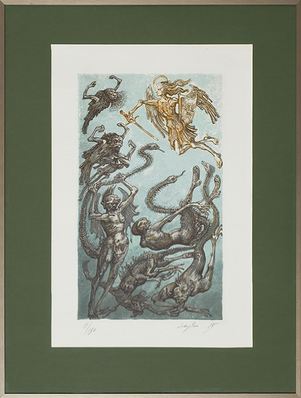 Jan Lebenstein (Brześć Litewski 1930 - Kraków 1999) w latach 1948-1954 studiował malarstwo w ASP w Warszawie pod kierunkiem prof. Eugeniusza Eibischa i Artura Nachta-Samborskiego. W 1955 wziął udział w wystawie w warszawskim Arsenale. Zaprzyjaźniony w czasie studiów z Mironem Białoszewskim, swą pierwszą wystawę indywidualną pokazał w 1956 w Teatrze na Tarczyńskiej. W 1959 zdobył Grand Prix de la Ville de Paris na I Biennale Młodych w Paryżu i w tym roku przeniósł się na stałe do Paryża. Po seriach "figur kreślonych" (na papierze milimetrowym) i "figur hieratycznych" z lat 1955-1958 maluje cykl "figur osiowych" (1958-1962), które wystawia w Paryżu i USA. Równolegle w 1960 zaczyna rysowane "karnety", rodzaj dziennika, który w przyszłości dostarczy motywów wykorzystanych w obrazach. W latach 1964-1965 maluje "Bestiarium", cykl fakturowych, archaizowanych stworów przypominających prehistoryczne wykopaliska. Bezpośrednio po nich wprowadza do swych obrazów postaci ludzkie i fantastyczne, odgrywające sceny ni to mitologiczne, ni to ze snu, często przesycone erotyką. W 1970 projektuje witraże dla Centre du Dialogue w Paryżu. W W 1971 otrzymuje obywatelstwo francuskie 1974 powstają gwasze inspirowane Folwarkiem zwierzęcym George'a Orwella. W latach 1976-1989 tworzy wyłącznie w technice gwaszu i pastelu, podejmując tematykę mitologiczną i zaczerpniętą z Biblii: cykle ilustracji do Księgi Hioba (wyd. 1979) i do Apokalipsy (wyd. 1986) w nowych przekładach Czesława Miłosza. W 1989 powraca do malarstwa olejnego (cykl "Pergamon"). Artysta otrzymał m. in. nagrodę Fundacji im. Alfreda Jurzykowskiego w 1976, Nagrodę Muzeum Archidiecezji Warszawskiej w 1985, Nagrodę im. Jana Cybisa w 1987.