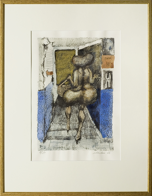 Jan Lebenstein (Brześć Litewski 1930 - Kraków 1999) w latach 1948-1954 studiował malarstwo w ASP w Warszawie pod kierunkiem prof. Eugeniusza Eibischa i Artura Nachta-Samborskiego. W 1955 wziął udział w wystawie w warszawskim Arsenale. Zaprzyjaźniony w czasie studiów z Mironem Białoszewskim, swą pierwszą wystawę indywidualną pokazał w 1956 w Teatrze na Tarczyńskiej. W 1959 zdobył Grand Prix de la Ville de Paris na I Biennale Młodych w Paryżu i w tym roku przeniósł się na stałe do Paryża. Po seriach "figur kreślonych" (na papierze milimetrowym) i "figur hieratycznych" z lat 1955-1958 maluje cykl "figur osiowych" (1958-1962), które wystawia w Paryżu i USA. Równolegle w 1960 zaczyna rysowane "karnety", rodzaj dziennika, który w przyszłości dostarczy motywów wykorzystanych w obrazach. W latach 1964-1965 maluje "Bestiarium", cykl fakturowych, archaizowanych stworów przypominających prehistoryczne wykopaliska. Bezpośrednio po nich wprowadza do swych obrazów postaci ludzkie i fantastyczne, odgrywające sceny ni to mitologiczne, ni to ze snu, często przesycone erotyką. W 1970 projektuje witraże dla Centre du Dialogue w Paryżu. W W 1971 otrzymuje obywatelstwo francuskie 1974 powstają gwasze inspirowane Folwarkiem zwierzęcym George'a Orwella. W latach 1976-1989 tworzy wyłącznie w technice gwaszu i pastelu, podejmując tematykę mitologiczną i zaczerpniętą z Biblii: cykle ilustracji do Księgi Hioba (wyd. 1979) i do Apokalipsy (wyd. 1986) w nowych przekładach Czesława Miłosza. W 1989 powraca do malarstwa olejnego (cykl "Pergamon"). Artysta otrzymał m. in. nagrodę Fundacji im. Alfreda Jurzykowskiego w 1976, Nagrodę Muzeum Archidiecezji Warszawskiej w 1985, Nagrodę im. Jana Cybisa w 1987.