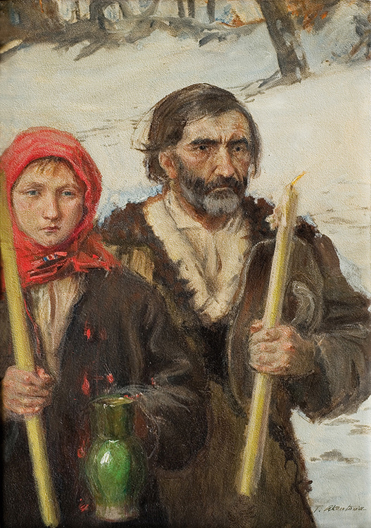 Teodor Axentowicz (Braszów w Siedmiogrodzie 1859 - Kraków 1938) – malarz, pastelista, litograf – był jednym z najbardziej znanych i cenionych malarzy polskich. Kształcił się w Akademii Sztuk Pięknych w Monachium pod kierunkiem Gabriela Hackla, Aleksandra Wagnera, Gyuli Benczúra. Studia uzupełniał w Paryżu, gdzie następnie przebywał przez lat kilkanaście. Brał udział w paryskich Salonach; w 1890 otrzymał członkostwo Société Nationale des Beaux-Arts. W tym czasie wielokrotnie wyjeżdżał również do Londynu. W 1895 powrócił do kraju i zamieszkał na stałe w Krakowie, powołany na profesora tamtejszej Szkoły Sztuk Pięknych (od 1900 Akademii). W uczelni tej nauczał nieprzerwanie do 1934, dwukrotnie pełniąc funkcję rektora (lata 1910-11 oraz 1927-28). Był jednym z członków-założycieli Towarzystwa Artystów Polskich „Sztuka”, członkiem wiedeńskiej „Secesji” i współpracownikiem jej pisma „Ver Sacrum”. Powodzenie przyniosły mu zwłaszcza idealizowane wizerunki wytwornych dam oraz wdzięczne portrety dziecięce. Malował też obrazy o tematyce rodzajowej; był jednym z pierwszych malarzy Huculszczyzny i Hucułów. Tworzył obrazy historyczne i kompozycje symboliczne związane z upływem czasu, przemijaniem, starością. We wczesnym, monachijskim okresie były to obrazy utrzymane w duchu akademickiego realizmu; na późniejszą twórczość artysty wywarło wpływ angielskie malarstwo XVIII w. oraz dzieła malarzy współczesnych - Boldoniego, Whistlera, Sargenta. Jego obrazy cechuje dekoracyjność, elegancja, świeżość subtelnej gamy kolorów i delikatna secesyjna stylizacja. Początkowo malował olejno i akwarelą, a po 1890 przede wszystkim mistrzowsko opanowaną techniką pastelu. Zajmował się ilustratorstwem i litografią, projektował plakaty wystaw „Sztuki”.