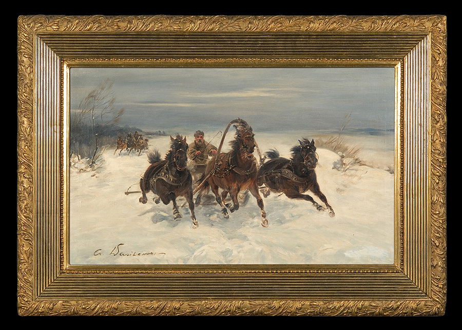 Czesław Wasilewski (ok. 1875 - Warszawa/ Łódź 1946?47) to popularny w okresie międzywojennym warszawski malarz, autor obrazów inspirowanych płótnami Kossaka, Brandta, Chełmońskiego, Wierusza-Kowalskiego czy Fałata. Był samoukiem; wprawdzie w 1911 zapisał się do warszawskiej Szkoły Sztuk Pięknych, ale o jego studiach nic bliższego nie wiadomo. Być może uczęszczał tam (1913-1917) do pracowni Wojciecha Kossaka, dla którego później, na początku lat dwudziestych, przygotowywał podmalówki do obrazów. Uczestniczył w wystawie w Lublinie (1922), wystawiał na Salonach warszawskiej Zachęty (1925,1926, 1927), w Katowicach (1926), Częstochowie (1927), Gdyni (1929), Kaliszu (1931), Poznaniu (1928, 1931). Malował przede wszystkim liczne zaprzęgi, sanny, wyjazdy na polowania, wypadki w podróży, ułanów na patrolu, łosie, sarny i dziki w lesie. Tworzył także nastrojowe pejzaże, wyraźnie inspirowane malarstwem J. Chełmońskiego Rzadziej malował także kwiaty i martwe natury. Utożsamiany z malarzem o nazwisku „Zygmuntowicz”, którego prace pojawiały się na rynku sztuki od trzydziestych lat XX wieku. Stawiany przed tym nazwiskiem inicjał I. lub F., sugerować może imię Ignacy lub Franciszek. Sylwetkę malarza bliżej omówił S. Bołdok w artykule Malarz o dwóch nazwiskach (Art and Business 1992, nr 7-8, s. 48-49).