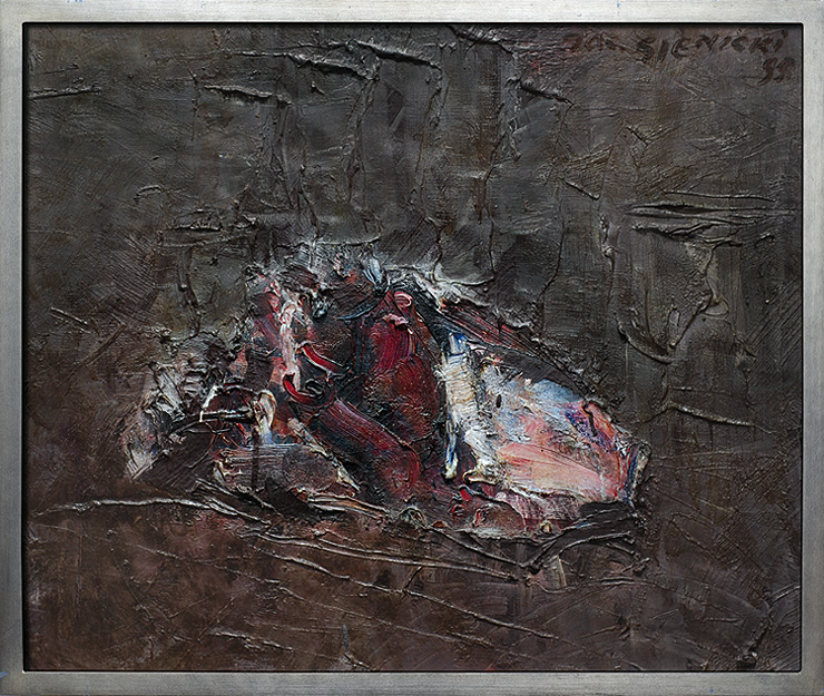 Jacek Sienicki (Warszawa 29 II 1928 - Warszawa 14 XII 2000) studiował na Wydziale Malarstwa ASP w Warszawie, gdzie w 1954 uzyskał dyplom w pracowni prof. Artura Nachta-Samborskiego. W 1955 był uczestnikiem Wystawy Młodej Plastyki w warszawskim Arsenale. Udział w tej manifestacji był nie tylko właściwym debiutem artysty, ale też na lata określił jego postawę, dzieloną z innymi „arsenałowcami“, której zasady to: prymat etyki, sceptycyzm wobec przemijających mód artystycznych, wierność sobie. W 1955 Sienicki podjął pracę pedagogiczną w macierzystej uczelni. Przeszedł wszystkie szczeble akademickie, otrzymując tytuł profesora w 1981. Był laureatem liczących się nagród, m.in. Nagrody Krytyki im. Cypriana Kamila Norwida w 1974, Nagrody im. Jana Cybisa (niezależnej) w 1984, nagrody Fundacji im. Alfreda Jurzykowskiego w 1993. Jego malarstwo od wczesnych lat oscylowało między figuratywizmem o często dramatycznej wymowie egzystencjalnej i skłonnością do abstrakcji. Przy tym malarz nie opuszczał dość ograniczonego zestawu ulubionych motywów, do których należały: czaszki końskie, wydłużone postaci, ciemne wnętrza, które rozgrywał w podobnej, ciemno-zimnej gamie barwnej. Równolegle do malarstwa wiele rysował, zazwyczaj węglem, traktując prace w tej technice jako autonomiczne dzieła.
