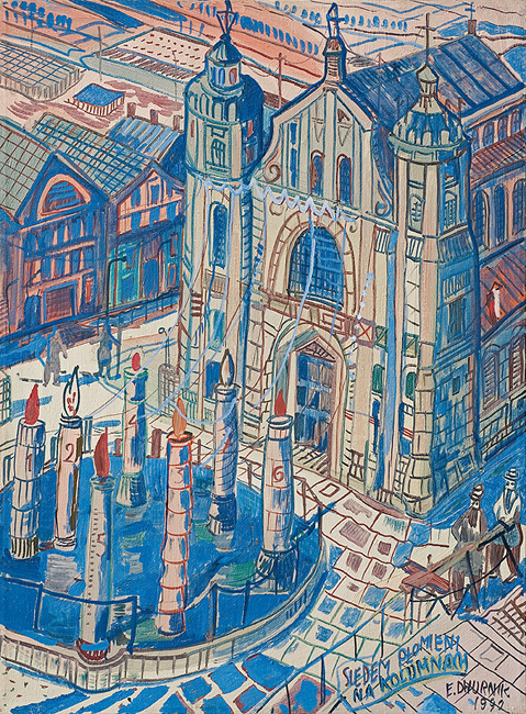 Edward Dwurnik (Radzymin 19 IV 1943 - Warszawa 28 X 2018) studiował malarstwo w ASP w Warszawie (1963-1970), jednak jako swego „mistrza“ wymienia Nikifora. Jego to prace, zobaczone po raz pierwszy w 1965, zainspirowały ówczesnego studenta III roku do narysowania pierwszych prac z cyklu „Podróże autostopem“, które kontynuował w nastepnych latach. W 1972-1978 powstawał cykl „Sportowcy“, w którym portretowane były, dodajmy - kąśliwie, typowe postaci z lat 70. Równolegle od 1975 powstawał cykl „Robotnicy“, który kulminował w okresie „Solidarności“ 1980-1981. Za prace z tego cyklu Dwurnik otrzymał w 1981 Nagrodę Krytyki Artystycznej im. Cypriana Kamila Norwida, natomiast za obrazy z cyklu „Warszawa“ (1981), proroczo zapowiadające stan wojenny - Nagrodę Kulturalną „Solidarności“ podziemnej w 1983. W latach 80. malarstwo Dwurnika przybrało wyraz ekspresyjny i dramatyczny. Powstające w tej dekadzie obrazy miały niejednokrotnie wymowę polityczną, przybierały też kostium historyczny, tak czy inaczej odnoszący się do współczesnych spraw i realiów. Cykl „Droga na Wschód“ (1989-91) upamiętniał ofiary stalinizmu, natomiast cykl „Od Grudnia do Czerwca“ (1990-94) - ofiary stanu wojennego. Zarówno ideowe, jak i czysto malarskie walory tych prac przyniosły artyście ogromne uznanie, zarówno w kraju jak i za granicą. Jego wyrazem była prestiżowa nagroda Fundacji Coutts & Co w Zurychu (1992). W latach 90. powstają cykle będące kontynuacją „Podróży autostopem“: „Niebieskie miasta“ (od 1993) i „Diagonale“ (od 1996), jak również kompozycje nowego typu, jak widoki morskie (cykl „Błękitne“, 1992-93) czy cykl „Wyliczanka“ (1996-99). Artysta wiele wystawia, miał ok. 100 wystaw indywidualnych w Polsce i za granicą, brał też udział w licznych wystawach i festiwalach krajowych i międzynarodowych, m.in.: X Biennale Sztuki Współczesnej, Menton 1974, Documenta 7, Kassel 1982, 5th Biennale, Sydney 1985, XIX Biennale Sztuki, Sao Paulo 1987; Olimpiada Sztuki, Seul 1988. Równolegle z malarstwem uprawiał rysunek, collage, grafikę warsztatową (litografia, techniki metalowe, kserografia, stemple) i użytkową (ilustracja, plakaty do własnych wystaw indywidualnych).