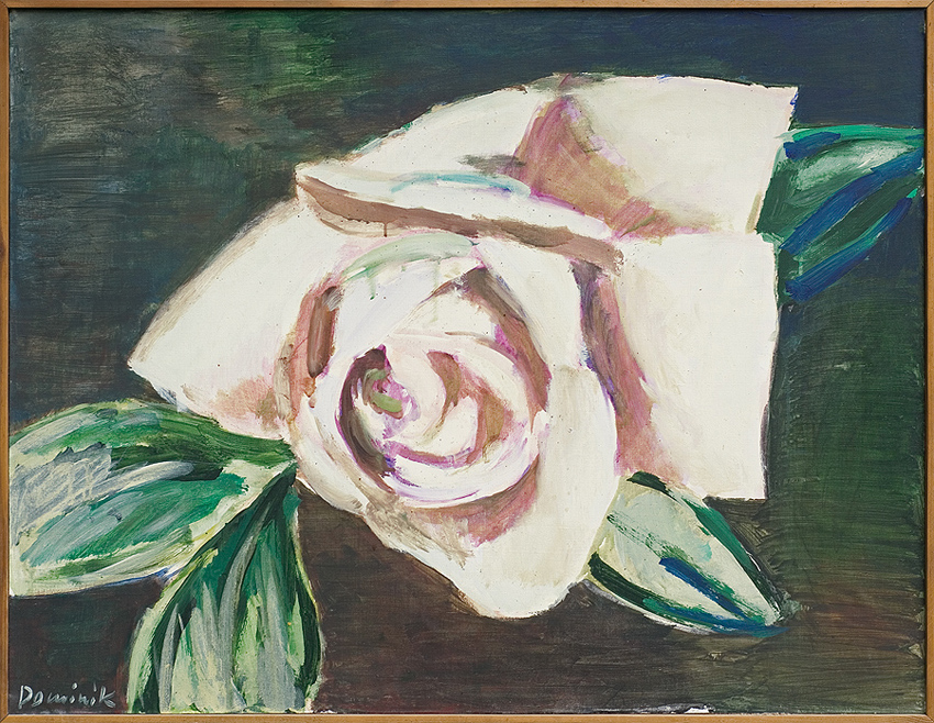 Tadeusz Dominik (Szymanów 14 I 1928 - Warszawa 20 V 2014) studiował na Wydziale Malarstwa ASP w Warszawie pod kierunkiem prof. J.Cybisa (1946-51, dyplom 1953). Od 1951 był pedagogiem na macierzystym Wydziale, początkowo jako asystent Cybisa. Od 1965 prowadził własną pracownię, w 1979 otrzymał tytuł profesora. W 1990 przeszedł na emeryturę. W czasie studiów oddziałały nań - za pośrednictwem osobowości i sztuki Cybisa - idee polskiego koloryzmu, które następnie twórczo i samodzielnie kontynuował. Początkowo tworzył obrazy figuratywne. Debiutował na słynnej wystawie w warszawskim Arsenale w 1955, gdzie zdobył nagrodę. W tym okresie obok malarstwa uprawiał drzeworyt, operujący szerokimi płaszczyznami bieli i czerni (drzeworyty wystawiał m.in. na Biennale w Wenecji w 1956). W drugiej poł. lat 50. zaczął malować obrazy abstrakcyjne, początkowo utrzymane w ekspresyjnej i spontanicznej stylistyce malarstwa informel. W latach 60. wzbogacił swe prace o efekty fakturowe. Niezmienną inspiracją była dla malarza natura, bogactwo i kolorystyka jej form. Pozostał jej wierny do dziś, poddając zmianom sam sposób malowania. Stopniowo rozjaśniał i wygładzał swe kompozycje, wprowadzając efekty dekoracyjne, jak rytmiczne powtórzenia form czy rodzaj malowanych „rastrów“, regularnie znaczących fragmenty kompozycji. Wśród wielu nagród otrzymał m.in. laur „Złotego Grona“ w Zielonej Górze w 1963, Grand Prix Festiwalu Polskiego Malarstwa Współczesnego w Szczecinie w 1968, nagrodę im. George’a Rowney’a w Londynie w 1973 i Nagrodę im. Jana Cybisa w Warszawie w 1973. Równolegle z malarstwem zajmował się gobelinem, ceramiką, również grafiką komputerową.
