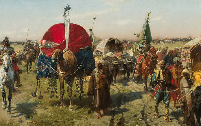 Obraz przedstawia pochód wojsk polskich wracających spod Wiednia po zwycięstwie nad Turkami w roku 1683 i „odznacza się spokojnym rytmem narracji /.../ Malownicza grupa polskich rycerzy w powolnym ruchu przemierza bezdroża; towarzysze pancerni konwojują jeńców i wozy tureckie; na pierwszym planie, nieomal wychodząc z obrazu wprost na widza, kroczy wielbłąd z ozdobnym namiotem na grzbiecie, dalej dwa woły ciągną arbę z haremem tureckich hurys, w głębi dalsze wozy, masa ludzi i koni. Roztacza tu Brandt całą barwność i przepych Wschodu: fantazję strojów i bogactwo uzbrojenia, chorągwi, zdobycznych łupów, niezwykłość typów ludzkich. Frontalnie, panoramicznie ujęta scena wprost wciąga widza w swą iluzjonistycznie zasugerowaną przestrzeń”.