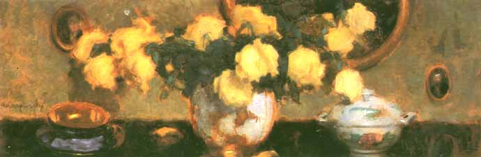 Alfons Karpiński (Rozwadów, dziś dzielnica Stalowej Woli 1875 - Kraków 1961) w latach 1891-1899 studiował w krakowskiej Szkole Sztuk Pięknych pod kierunkiem Floriana Cynka, Izydora Jabłońskiego, Władysława Łuszczkiewicza i Leona Wyczółkowskiego, a następnie kształcił się jeszcze u Antona Ažbégo w Monachium (1903), u Kazimierza Pochwalskiego w Wiedniu, a od 1907 także w Paryżu. Podróżował do Włoch i Londynu. Stale mieszkał w Krakowie; związany z tamtejszym środowiskiem skupionym wokół „Zielonego Balonika” projektował dekoracje do przedstawień kabaretu. Należał do Tow. Artystów Polskich „Sztuka”, grupy „Zero”, był członkiem wiedeńskiego stowarzyszenia „Secesja” i krakowskiego TPSP. Uczestniczył w wielu wystawach w kraju i za granicą. W czasie I wojny światowej służył w armii austriackiej. Na bogatą twórczość artysty składają się wczesne sceny rodzajowe z podkrakowskiej wsi, pejzaże i portrety, wśród nich zwłaszcza portrety kobiece, które przyniosły mu szczególną popularność. Z czasem głównym – obok portretu – tematem jego obrazów stały się martwe natury z kwiatami, dekoracyjne kompozycje o stonowanej gamie barwnej. Artysta zajmował się także grafiką i ilustratorstwem.