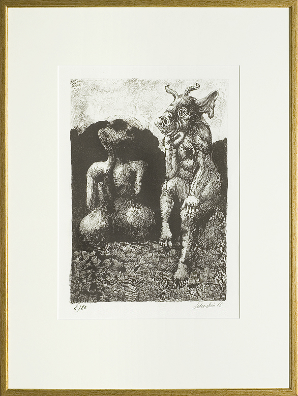 Jan Lebenstein (Brześć Litewski 1930 - Kraków 1999) w latach 1948-1954 studiował malarstwo w ASP w Warszawie pod kierunkiem prof. Eugeniusza Eibischa i Artura Nachta-Samborskiego. W 1955 wziął udział w wystawie w warszawskim Arsenale. Zaprzyjaźniony w czasie studiów z Mironem Białoszewskim, swą pierwszą wystawę indywidualną pokazał w 1956 w Teatrze na Tarczyńskiej. W 1959 zdobył Grand Prix de la Ville de Paris na I Biennale Młodych w Paryżu i w tym roku przeniósł się na stałe do Paryża. Po seriach "figur kreślonych" (na papierze milimetrowym) i "figur hieratycznych" z lat 1955-1958 maluje cykl "figur osiowych" (1958-1962), które wystawia w Paryżu i USA. Równolegle w 1960 zaczyna rysowane "karnety", rodzaj dziennika, który w przyszłości dostarczy motywów wykorzystanych w obrazach. W latach 1964-1965 maluje "Bestiarium", cykl fakturowych, archaizowanych stworów przypominających prehistoryczne wykopaliska. Bezpośrednio po nich wprowadza do swych obrazów postaci ludzkie i fantastyczne, odgrywające sceny ni to mitologiczne, ni to ze snu, często przesycone erotyką. W 1970 projektuje witraże dla Centre du Dialogue w Paryżu. W W 1971 otrzymuje obywatelstwo francuskie 1974 powstają gwasze inspirowane Folwarkiem zwierzęcym George'a Orwella. W latach 1976-1989 tworzy wyłącznie w technice gwaszu i pastelu, podejmując tematykę mitologiczną i zaczerpniętą z Biblii: cykle ilustracji do Księgi Hioba (wyd. 1979) i do Apokalipsy (wyd. 1986) w nowych przekładach Czesława Miłosza. W 1989 powraca do malarstwa olejnego (cykl "Pergamon"). Artysta otrzymał m. in. nagrodę Fundacji im. Alfreda Jurzykowskiego w 1976, Nagrodę Muzeum Archidiecezji Warszawskiej w 1985, Nagrodę im. Jana Cybisa w 1987.