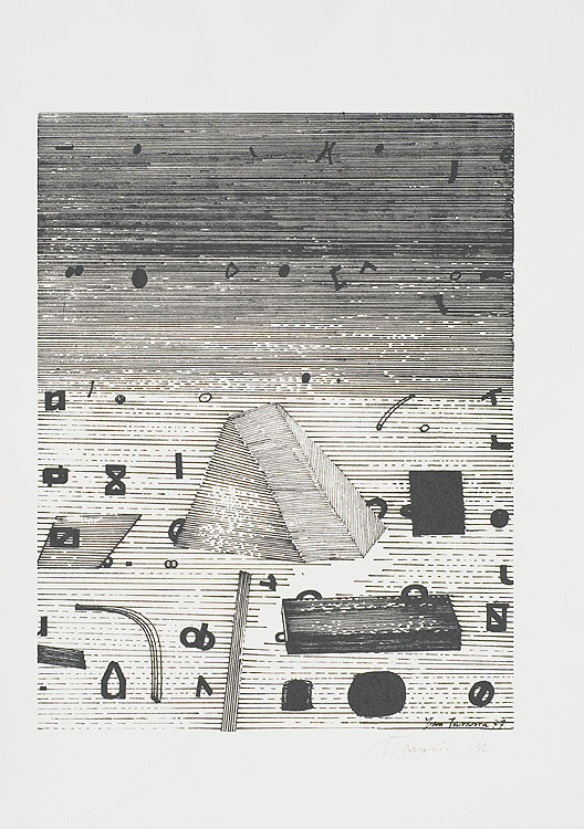 Jan Tarasin (Kalisz 11 IX 1926 - Warszawa 8 VIII 2009) studiował malarstwo w ASP w Krakowie pod kierunkiem prof. Zbigniewa Pronaszki (1946-1951). Jeszcze jako student zadebiutował na I Wystawie Sztuki Nowoczesnej w Krakowie w 1948/49. W połowie lat 50. stworzył cykle litografii: „Nowa Huta i jej mieszkańcy“, 1954, „Dom“, 1955). W pierwszym przeciwstawił się oficjalnemu optymizmowi, w drugim, operując symboliką martwej natury, zawarł treści egzystencjalne i odnoszące do niedawnego dramatu wojny. Po 1956 zaczął malować obrazy niefiguratywne. Układy wyodrębnionych elementów (określanych jako „przedmioty“) umieszczane były przez artystę na płaszczyźnie (cykl „Wnętrze“, 1957) ), lub w aluzyjnej przestrzeni (cykle „Uczta“, 1957, „Brzeg“, 1962-1964, „Przedmioty policzone“, od 1968, „Antykwariat“, 1968). Zasada ta utrzymuje się w jego malarstwie w następnych latach, różnice między okresami twórczości dotyczą sposobu opracowania „przedmiotów“ i ich usytuowania w przestrzeni obrazu lub wobec tła. Od lat 70. „przedmioty“ zmieniają się w graficzne, zwykle czarne znaki na jasnych tłach (cykl „Kolekcja“, od 1971). Tła z kolei bywają iluzyjnie przestrzenne, zróżnicowane walorowo, miękkie. W latach 90. artysta wrócił do kolorystycznego, bardziej malarskiego rozwiązywania zarówno znaków, jak i teł, często ciemnych lub przenikających się z „przedmiotami“ (cykl „Wylęgarnia przedmiotów“, 1992). Tarasin od 1962 jest członkiem „Grupy Krakowskiej“. W 1963-67 uczył na Wydziale Architektury Wnętrz krakowskiej ASP. W 1967 przeniósł się do Warszawy, w 1974 podjął pracę pedagogiczną na Wydziale Malarstwa ASP w Warszawie. W 1987-90 był rektorem tej uczelni. W 1976 otrzymał Nagrodę Krytyki Artystycznej im. Cypriana Kamila Norwida, w 1984 Nagrodę im. Jana Cybisa.; Nagroda na MB Sztuki w San Marino 1965. Równolegle z malarstwem zajmował się rysunkiem i grafiką - do lat 60. litografią, od 1974 serigrafią. W 1974-1981 wydał 8 autorskich „Zeszytów“ z serigrafiami i własnymi tekstami. W 1995 w Galerii Zachęta odbyła się wystawa artysty, której towarzyszył monograficzny katalog.