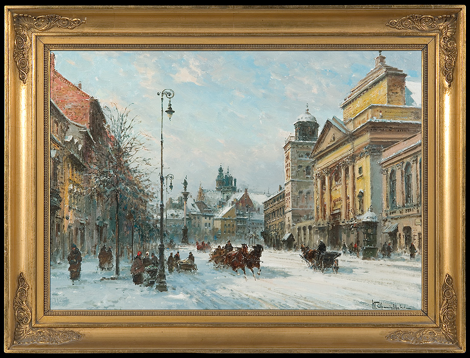 Władysław Chmieliński (Warszawa 1911 - Warszawa 1979) był malarzem związanym z Warszawą, gdzie stale mieszkał i pracował. W latach 1926-1931 studiował w warszawskiej Miejskiej Szkole Sztuk Zdobniczych i Malarstwa (dawna Klasa Rysunkowa). Wiodącym tematem jego obrazów były widoki miejskie, malowane olejno i akwarelą. W latach 1935-1938 stworzył cykl akwarel przedstawiających obiekty polskiej architektury; wśród nich, widoki Sandomierza, Krakowa, Kazimierza nad Wisłą, a także wnętrza zabytkowych kościołów czy pałaców, m.in. Zamku Królewskiego w Warszawie i Pałacu w Wilanowie. Malował także pejzaże i wiejskie sceny rodzajowe – kuligi, sanny, zaprzęgi, wesela, konie na tle krajobrazu. W latach 1967-1969 wyjeżdżał na dłuższe pobyty do Danii. W latach 1936-1939 artysta używał także pseudonimu „Władysław Stachowicz”.