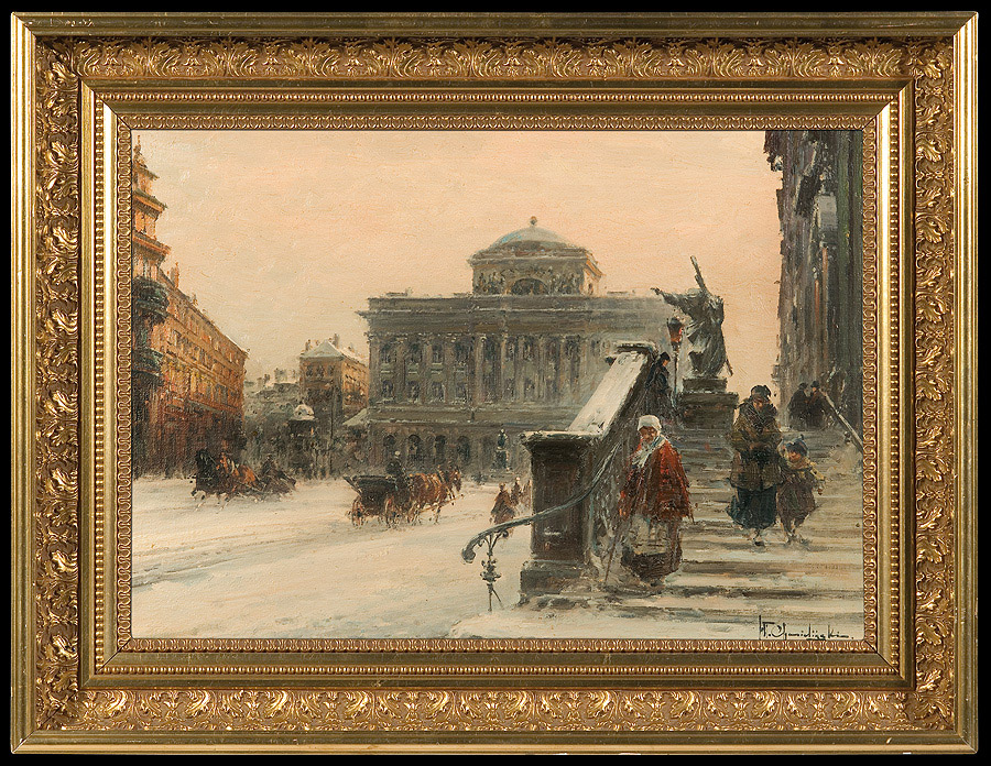 Władysław Chmieliński (Warszawa 1911 - Warszawa 1979) był malarzem związanym z Warszawą, gdzie stale mieszkał i pracował. W latach 1926-1931 studiował w warszawskiej Miejskiej Szkole Sztuk Zdobniczych i Malarstwa (dawna Klasa Rysunkowa). Wiodącym tematem jego obrazów były widoki miejskie, malowane olejno i akwarelą. W latach 1935-1938 stworzył cykl akwarel przedstawiających obiekty polskiej architektury; wśród nich, widoki Sandomierza, Krakowa, Kazimierza nad Wisłą, a także wnętrza zabytkowych kościołów czy pałaców, m.in. Zamku Królewskiego w Warszawie i Pałacu w Wilanowie. Malował także pejzaże i wiejskie sceny rodzajowe – kuligi, sanny, zaprzęgi, wesela, konie na tle krajobrazu. W latach 1967-1969 wyjeżdżał na dłuższe pobyty do Danii. W latach 1936-1939 artysta używał także pseudonimu „Władysław Stachowicz”.