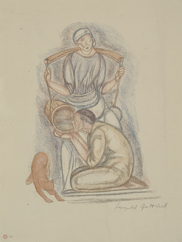 Leopold Gottlieb (Drohobycz 1883 - Paryż 1934) - młodszy brat malarza Maurycego - w latach 1896-1902 studiował w krakowskiej Szkole Sztuk Pięknych pod kierunkiem J. Malczewskiego i T. Axentowicza i następnie w prywatnej szkole A. Ažbego w Monachium. W 1904 na stałe zamieszkał w Paryżu, gdzie związał się z artystycznym środowiskiem Montparnasse'u, blisko przyjaźniąc się z M. Kislingiem i E. Zakiem. W 1910 podróżował do Jerozolimy, gdzie wykładał w Szkole Sztuki i Rzemiosła „Bezalel”. W 1913-1914 był w Hiszpanii. W czasie I wojny światowej służył w I Brygadzie Legionów. Rysował wówczas całe cykle portretów żołnierzy i oficerów, które przyniosły mu znaczną popularność. Po wojnie miał pracownię w Wiedniu, przez dłuższy czas przebywał też w Niemczech. Należał do wiedeńskiego Hagebundu, w 1905 był współzałożycielem „Grupy Pięciu”, w latach 1917-1919 uczestniczył w wystawach „Formistów”, od 1929 był członkiem Stowarzyszenia „Rytm”. Wystawiał w kraju i za granicą, m.in. w Paryżu, Barcelonie, Wiedniu, Berlinie, Zurychu, Bazylei, Genewie, Pittsburghu. We wcześniejszym okresie malował przede wszystkim ekspresyjne portrety, później obrazy o treściach religijnych, a w latach dwudziestych także pejzaże i wielopostaciowe sceny ujęte w rytmiczne układy kompozycyjne. Zajmował się również grafiką. Prace artysty znajdują się w licznych muzeach i kolekcjach prywatnych.
