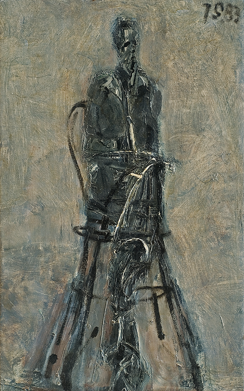 Jacek Sienicki (Warszawa 29 II 1928 - Warszawa 14 XII 2000) studiował na Wydziale Malarstwa ASP w Warszawie, gdzie w 1954 uzyskał dyplom w pracowni prof. Artura Nachta-Samborskiego. W 1955 był uczestnikiem Wystawy Młodej Plastyki w warszawskim Arsenale. Udział w tej manifestacji był nie tylko właściwym debiutem artysty, ale też na lata określił jego postawę, dzieloną z innymi „arsenałowcami“, której zasady to: prymat etyki, sceptycyzm wobec przemijających mód artystycznych, wierność sobie. W 1955 Sienicki podjął pracę pedagogiczną w macierzystej uczelni. Przeszedł wszystkie szczeble akademickie, otrzymując tytuł profesora w 1981. Był laureatem liczących się nagród, m.in. Nagrody Krytyki im. Cypriana Kamila Norwida w 1974, Nagrody im. Jana Cybisa (niezależnej) w 1984, nagrody Fundacji im. Alfreda Jurzykowskiego w 1993. Jego malarstwo od wczesnych lat oscylowało między figuratywizmem o często dramatycznej wymowie egzystencjalnej i skłonnością do abstrakcji. Przy tym malarz nie opuszczał dość ograniczonego zestawu ulubionych motywów, do których należały: czaszki końskie, wydłużone postaci, ciemne wnętrza, które rozgrywał w podobnej, ciemno-zimnej gamie barwnej. Równolegle do malarstwa wiele rysował, zazwyczaj węglem, traktując prace w tej technice jako autonomiczne dzieła.