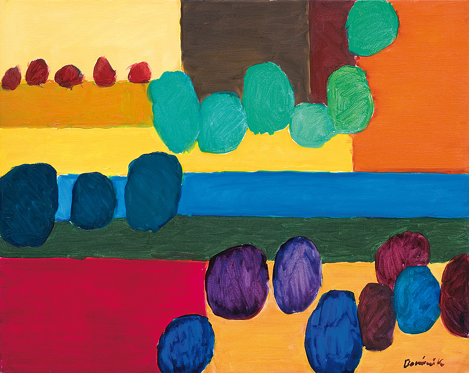 Tadeusz Dominik (Szymanów 14 I 1928 - Warszawa 20 V 2014) studiował na Wydziale Malarstwa ASP w Warszawie pod kierunkiem prof. J.Cybisa (1946-51, dyplom 1953). Od 1951 był pedagogiem na macierzystym Wydziale, początkowo jako asystent Cybisa. Od 1965 prowadził własną pracownię, w 1979 otrzymał tytuł profesora. W 1990 przeszedł na emeryturę. W czasie studiów oddziałały nań - za pośrednictwem osobowości i sztuki Cybisa - idee polskiego koloryzmu, które następnie twórczo i samodzielnie kontynuował. Początkowo tworzył obrazy figuratywne. Debiutował na słynnej wystawie w warszawskim Arsenale w 1955, gdzie zdobył nagrodę. W tym okresie obok malarstwa uprawiał drzeworyt, operujący szerokimi płaszczyznami bieli i czerni (drzeworyty wystawiał m.in. na Biennale w Wenecji w 1956). W drugiej poł. lat 50. zaczął malować obrazy abstrakcyjne, początkowo utrzymane w ekspresyjnej i spontanicznej stylistyce malarstwa informel. W latach 60. wzbogacił swe prace o efekty fakturowe. Niezmienną inspiracją była dla malarza natura, bogactwo i kolorystyka jej form. Pozostał jej wierny do dziś, poddając zmianom sam sposób malowania. Stopniowo rozjaśniał i wygładzał swe kompozycje, wprowadzając efekty dekoracyjne, jak rytmiczne powtórzenia form czy rodzaj malowanych „rastrów“, regularnie znaczących fragmenty kompozycji. Wśród wielu nagród otrzymał m.in. laur „Złotego Grona“ w Zielonej Górze w 1963, Grand Prix Festiwalu Polskiego Malarstwa Współczesnego w Szczecinie w 1968, nagrodę im. George’a Rowney’a w Londynie w 1973 i Nagrodę im. Jana Cybisa w Warszawie w 1973. Równolegle z malarstwem zajmował się gobelinem, ceramiką, również grafiką komputerową.
