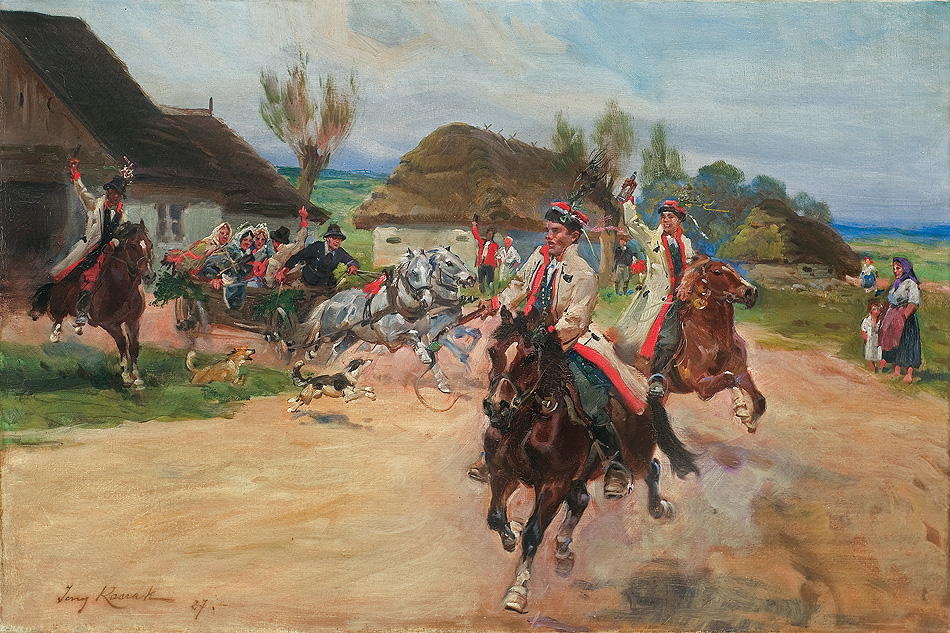 Jerzy Kossak (Kraków 1886 - Kraków 1955)- syn Wojciecha, wnuk Juliusza Kossaków - od wczesnego dzieciństwa malował pod kierunkiem ojca i dziadka. Kontynuator i naśladowca ich sztuki tworzył sceny batalistyczne, historyczne i rodzajowe z wszechobecnym motywem konia. Malował obrazy z powstania listopadowego, wojen napoleońskich oraz wiele scen z wojny 1920 roku. Najbardziej znaną jego kompozycją tego rodzaju był Cud nad Wisłą. Malował też liczne Pogonie i Pościgi ułanów za kozakami, Napady wilków, Polowania i Wesela. Tematyka tych prac sprawia, że stale cieszą się zainteresowaniem zbieraczy i publiczności, zawsze tłumnie odwiedzającej wystawy malarstwa Kossaków.