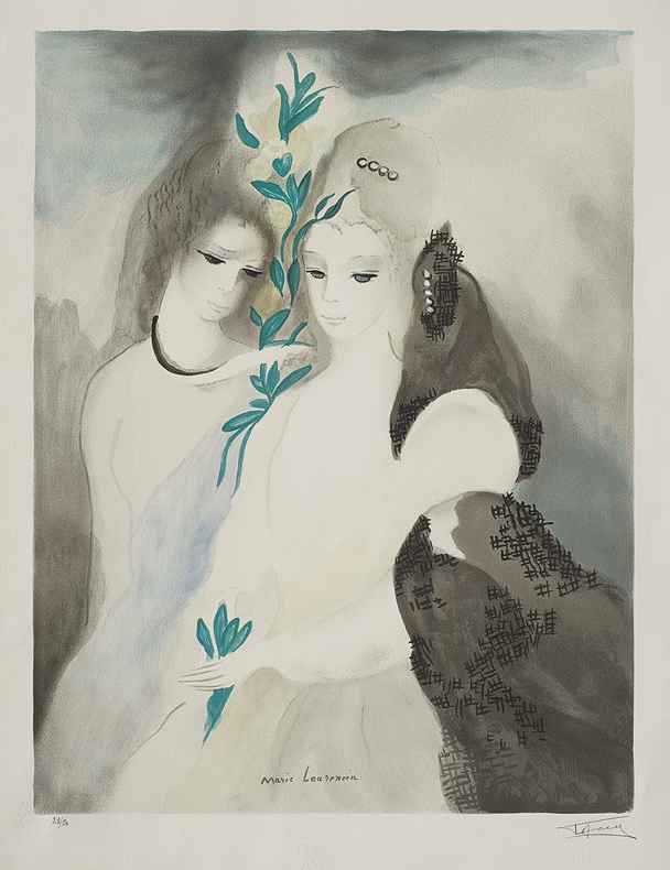 Marie Laurencin – francuska malarka, graficzka i poetka; studiowała w Paryżu, m.in. w Académie Humbert. Należała do kręgu paryskiej awandardy artystycznej skupionej wokół Bateau-Lavoir na Montmartre (m.in. K.Van Dongen, P.Picasso, G.Braque, J.Gris, A.Salmon, H.Matisse, A.Modigliani, A.Derain, M.Vlaminck). Brała udział w wystąpieniach kubistów. Kilkuletni związek połączył ją z G.Apollinairem, który w swoim traktacie Kubiści z 1913 nazywał ją „kubistą naukowym”. Malowała głównie kompozycje figuralne, stylizowane portrety kobiece, martwe natury i pejzaże. Kompozycje te odznaczają się poetyckim nastrojem, delikatnym uproszczonym rysunkiem i subtelnym stonowanym kolorytem. Artystka projektowała też tkaniny, dekoracje i kostiumy teatralne, m.in. dla zespołu Baletów Rosyjskich Diagilewa. Była też znakomitą ilustratorką, m.in. Alicji w Krainie Czarów.