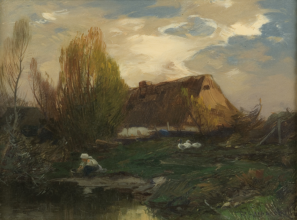 Roman Kochanowski (Kraków 1857 - Freising k. Monachium 1945) - malarz i grafik - był jednym z polskich artystów osiadłych i stałe działających w Monachium. Studia malarskie rozpoczął w Krakowie; początkowo w prywatnej pracowni Maksymiliana Cercha, a w latach 1873- 1875 w Szkole Sztuk Pięknych u Władysława Łuszczkiewicza i pejzażysty Henryka Grabińskiego. Przez następne dwa lata uczył się jeszcze na wydziale pejzażu w Akademii wiedeńskiej. W 1881 przeniósł się do Monachium, gdzie miał własną pracownię, a niebawem założył rodzinę. Często jednak przyjeżdżał do Krakowa, bywał w Poznańskiem, odbył podróż po Galicji i Podolu, rysując krajobrazy i widoki miast, które weszły następnie do albumu wydanego w Wiedniu w roku 1898. Artysta należał do monachijskiego Kunstvereinu, brał udział w wielu wystawach w Niemczech, w Wiedniu, w Londynie; swoje prace przesyłał też na pokazy krajowe. Malował przede wszystkim pejzaże a tylko z rzadka kwiaty i portrety. Stałym i ulubionym motywem jego obrazów był polski, podkrakowski krajobraz z wplecionymi weń postaciami ludzi. Obrazy artysty, malowane często na niewielkich deseczkach, pozbawione warstwy anegdotycznej odznaczają się niecodziennymi walorami malarskimi, harmonią koloru i pełnym liryzmu nastrojem. Zauważane i nagradzane na licznych wystawach były też wysoko cenione na rynku sztuki. W roku 1892, po wystawie w Wiedniu, jeden z obrazów Kochanowskiego zakupił do swoich zbiorów cesarz Franciszek Józef; dwa inne nabyli członkowie cesarskiej rodziny. Wielbicielem jego malarstwa był Karol Józef Luitpold, książę regent Bawarii. Wielka wrażliwość artysty na krajobraz i przyrodę widoczna jest także w jego rysunkach i akwafortach.