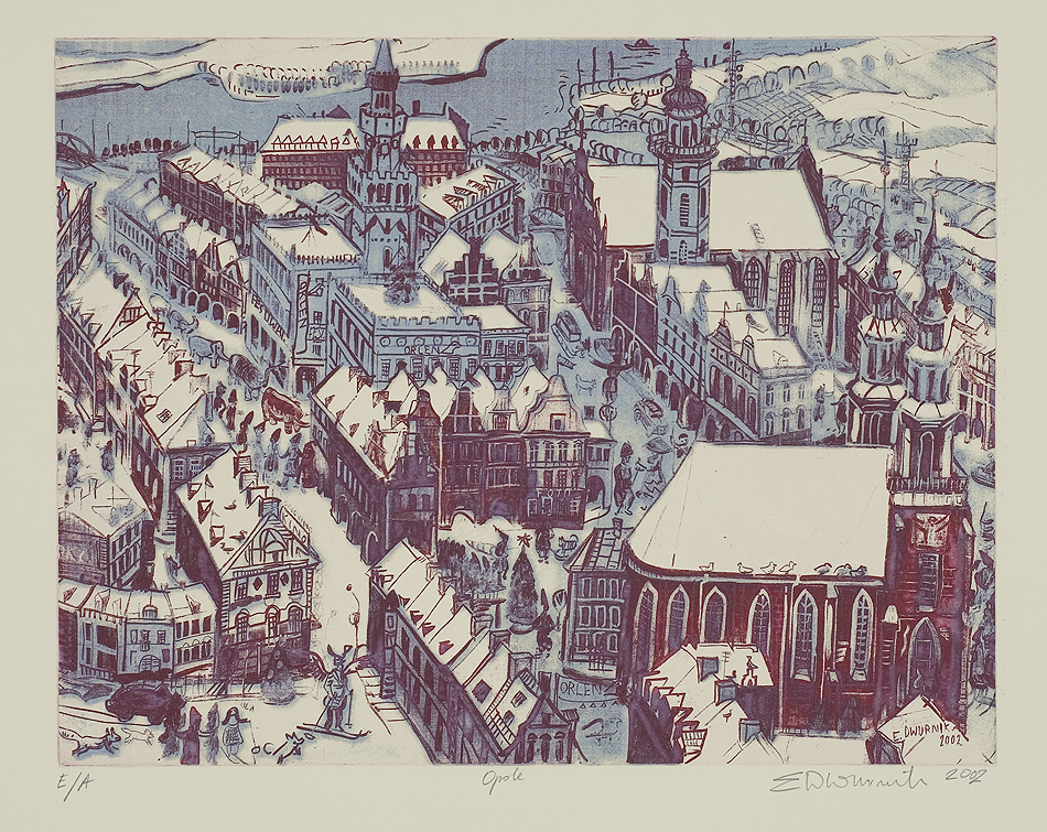 Edward Dwurnik (Radzymin 19 IV 1943 - Warszawa 28 X 2018) studiował malarstwo w ASP w Warszawie (1963-1970), jednak jako swego „mistrza“ wymienia Nikifora. Jego to prace, zobaczone po raz pierwszy w 1965, zainspirowały ówczesnego studenta III roku do narysowania pierwszych prac z cyklu „Podróże autostopem“, które kontynuował w nastepnych latach. W 1972-1978 powstawał cykl „Sportowcy“, w którym portretowane były, dodajmy - kąśliwie, typowe postaci z lat 70. Równolegle od 1975 powstawał cykl „Robotnicy“, który kulminował w okresie „Solidarności“ 1980-1981. Za prace z tego cyklu Dwurnik otrzymał w 1981 Nagrodę Krytyki Artystycznej im. Cypriana Kamila Norwida, natomiast za obrazy z cyklu „Warszawa“ (1981), proroczo zapowiadające stan wojenny - Nagrodę Kulturalną „Solidarności“ podziemnej w 1983. W latach 80. malarstwo Dwurnika przybrało wyraz ekspresyjny i dramatyczny. Powstające w tej dekadzie obrazy miały niejednokrotnie wymowę polityczną, przybierały też kostium historyczny, tak czy inaczej odnoszący się do współczesnych spraw i realiów. Cykl „Droga na Wschód“ (1989-91) upamiętniał ofiary stalinizmu, natomiast cykl „Od Grudnia do Czerwca“ (1990-94) - ofiary stanu wojennego. Zarówno ideowe, jak i czysto malarskie walory tych prac przyniosły artyście ogromne uznanie, zarówno w kraju jak i za granicą. Jego wyrazem była prestiżowa nagroda Fundacji Coutts & Co w Zurychu (1992). W latach 90. powstają cykle będące kontynuacją „Podróży autostopem“: „Niebieskie miasta“ (od 1993) i „Diagonale“ (od 1996), jak również kompozycje nowego typu, jak widoki morskie (cykl „Błękitne“, 1992-93) czy cykl „Wyliczanka“ (1996-99). Artysta wiele wystawia, miał ok. 100 wystaw indywidualnych w Polsce i za granicą, brał też udział w licznych wystawach i festiwalach krajowych i międzynarodowych, m.in.: X Biennale Sztuki Współczesnej, Menton 1974, Documenta 7, Kassel 1982, 5th Biennale, Sydney 1985, XIX Biennale Sztuki, Sao Paulo 1987; Olimpiada Sztuki, Seul 1988. Równolegle z malarstwem uprawiał rysunek, collage, grafikę warsztatową (litografia, techniki metalowe, kserografia, stemple) i użytkową (ilustracja, plakaty do własnych wystaw indywidualnych).