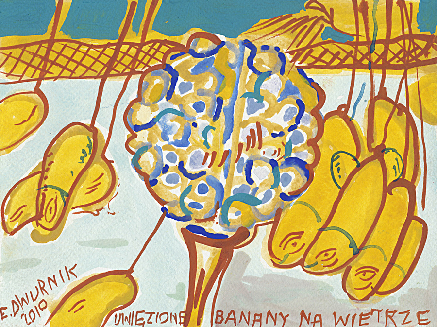 Edward Dwurnik (Radzymin 19 IV 1943 - Warszawa 28 X 2018) studiował malarstwo w ASP w Warszawie (1963-1970), jednak jako swego „mistrza“ wymienia Nikifora. Jego to prace, zobaczone po raz pierwszy w 1965, zainspirowały ówczesnego studenta III roku do narysowania pierwszych prac z cyklu „Podróże autostopem“, które kontynuował w nastepnych latach. W 1972-1978 powstawał cykl „Sportowcy“, w którym portretowane były, dodajmy - kąśliwie, typowe postaci z lat 70. Równolegle od 1975 powstawał cykl „Robotnicy“, który kulminował w okresie „Solidarności“ 1980-1981. Za prace z tego cyklu Dwurnik otrzymał w 1981 Nagrodę Krytyki Artystycznej im. Cypriana Kamila Norwida, natomiast za obrazy z cyklu „Warszawa“ (1981), proroczo zapowiadające stan wojenny - Nagrodę Kulturalną „Solidarności“ podziemnej w 1983. W latach 80. malarstwo Dwurnika przybrało wyraz ekspresyjny i dramatyczny. Powstające w tej dekadzie obrazy miały niejednokrotnie wymowę polityczną, przybierały też kostium historyczny, tak czy inaczej odnoszący się do współczesnych spraw i realiów. Cykl „Droga na Wschód“ (1989-91) upamiętniał ofiary stalinizmu, natomiast cykl „Od Grudnia do Czerwca“ (1990-94) - ofiary stanu wojennego. Zarówno ideowe, jak i czysto malarskie walory tych prac przyniosły artyście ogromne uznanie, zarówno w kraju jak i za granicą. Jego wyrazem była prestiżowa nagroda Fundacji Coutts & Co w Zurychu (1992). W latach 90. powstają cykle będące kontynuacją „Podróży autostopem“: „Niebieskie miasta“ (od 1993) i „Diagonale“ (od 1996), jak również kompozycje nowego typu, jak widoki morskie (cykl „Błękitne“, 1992-93) czy cykl „Wyliczanka“ (1996-99). Artysta wiele wystawia, miał ok. 100 wystaw indywidualnych w Polsce i za granicą, brał też udział w licznych wystawach i festiwalach krajowych i międzynarodowych, m.in.: X Biennale Sztuki Współczesnej, Menton 1974, Documenta 7, Kassel 1982, 5th Biennale, Sydney 1985, XIX Biennale Sztuki, Sao Paulo 1987; Olimpiada Sztuki, Seul 1988. Równolegle z malarstwem uprawiał rysunek, collage, grafikę warsztatową (litografia, techniki metalowe, kserografia, stemple) i użytkową (ilustracja, plakaty do własnych wystaw indywidualnych).