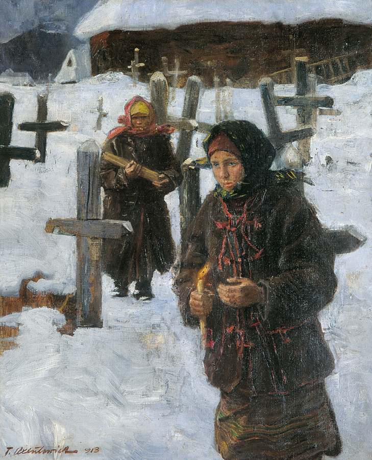 Teodor Axentowicz (Braszów w Siedmiogrodzie 1859 - Kraków 1938) – malarz, pastelista, litograf – był jednym z najbardziej znanych i cenionych malarzy polskich. Kształcił się w Akademii Sztuk Pięknych w Monachium pod kierunkiem Gabriela Hackla, Aleksandra Wagnera, Gyuli Benczúra. Studia uzupełniał w Paryżu, gdzie następnie przebywał przez lat kilkanaście. Brał udział w paryskich Salonach; w 1890 otrzymał członkostwo Société Nationale des Beaux-Arts. W tym czasie wielokrotnie wyjeżdżał również do Londynu. W 1895 powrócił do kraju i zamieszkał na stałe w Krakowie, powołany na profesora tamtejszej Szkoły Sztuk Pięknych (od 1900 Akademii). W uczelni tej nauczał nieprzerwanie do 1934, dwukrotnie pełniąc funkcję rektora (lata 1910-11 oraz 1927-28). Był jednym z członków-założycieli Towarzystwa Artystów Polskich „Sztuka”, członkiem wiedeńskiej „Secesji” i współpracownikiem jej pisma „Ver Sacrum”. Powodzenie przyniosły mu zwłaszcza idealizowane wizerunki wytwornych dam oraz wdzięczne portrety dziecięce. Malował też obrazy o tematyce rodzajowej; był jednym z pierwszych malarzy Huculszczyzny i Hucułów. Tworzył obrazy historyczne i kompozycje symboliczne związane z upływem czasu, przemijaniem, starością. We wczesnym, monachijskim okresie były to obrazy utrzymane w duchu akademickiego realizmu; na późniejszą twórczość artysty wywarło wpływ angielskie malarstwo XVIII w. oraz dzieła malarzy współczesnych - Boldoniego, Whistlera, Sargenta. Jego obrazy cechuje dekoracyjność, elegancja, świeżość subtelnej gamy kolorów i delikatna secesyjna stylizacja. Początkowo malował olejno i akwarelą, a po 1890 przede wszystkim mistrzowsko opanowaną techniką pastelu. Zajmował się ilustratorstwem i litografią, projektował plakaty wystaw „Sztuki”.