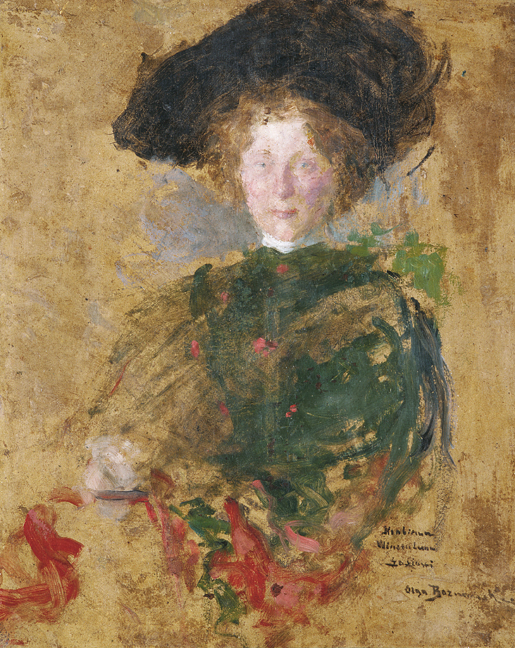 Olga Boznańska (Kraków 1865 - Paryż 1940) – wybitna malarka polska – kształciła się w Krakowie, początkowo pod kierunkiem matki, nauczycielki rysunków Eugenii Mondan, później u J. Siedleckiego, H. Lipińskiego, K. Pochwalskiego. W latach 1884-1886 uczęszczała także na Wyższe Kursy Artystyczne dla Kobiet przy Muzeum Techniczno-Przemysłowym. W 1886 wyjechała do Monachium gdzie uczyła się pod kierunkiem Karla Kricherdorfa i Wilhelma Dürra. Od 1889 pracowała samodzielnie i miała w Monachium własną pracownię. Od 1895 nauczała w prywatnej szkole malarstwa Theodora Humla. Z Monachium wielokrotnie jeździła do kraju, a także do Francji i Szwajcarii. W 1898 przeniosła się na stałe do Paryża, gdzie – przez lata – była jedną z czołowych postaci polskiej kolonii artystycznej. Debiutowała w roku 1886 na wystawie w krakowskim Towarzystwie Przyjaciół Sztuk Pięknych i odtąd stale uczestniczyła w wystawach krajowych i zagranicznych, zdobywając medale i wyróżnienia. W roku 1910 otrzymała francuską Legię Honorową, w roku 1938 order Polonia Restituta. Należała do wielu znaczących – polskich i europejskich – stowarzyszeń artystycznych. Główną domeną jej twórczości był portret – we wcześniejszym, monachijskim okresie często cało postaciowy, monumentalny i zwarty w formie; w czasach paryskich bardziej kameralny, nastrojowy, o zróżnicowanych walorowo plamach barwnych podporządkowanych dominacji jednego tonu, gubiących kontury i zacierających ostrość planów. Malowała też martwe natury i – rzadziej – pejzaże miejskie czy kompozycje rodzajowe.