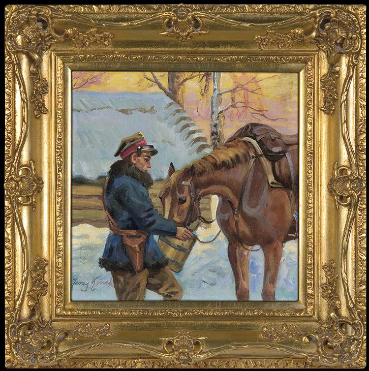 Jerzy Kossak (Kraków 1886 - Kraków 1955)- syn Wojciecha, wnuk Juliusza Kossaków - od wczesnego dzieciństwa malował pod kierunkiem ojca i dziadka. Kontynuator i naśladowca ich sztuki tworzył sceny batalistyczne, historyczne i rodzajowe z wszechobecnym motywem konia. Malował obrazy z powstania listopadowego, wojen napoleońskich oraz wiele scen z wojny 1920 roku. Najbardziej znaną jego kompozycją tego rodzaju był Cud nad Wisłą. Malował też liczne Pogonie i Pościgi ułanów za kozakami, Napady wilków, Polowania i Wesela. Tematyka tych prac sprawia, że stale cieszą się zainteresowaniem zbieraczy i publiczności, zawsze tłumnie odwiedzającej wystawy malarstwa Kossaków.