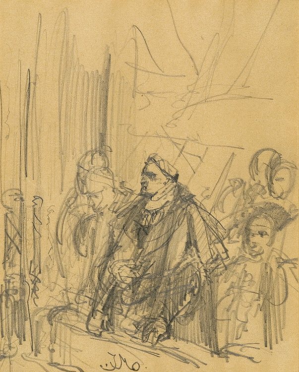 Jan Matejko (Kraków 1838 - Kraków 1893) - najwybitniejszy polski malarz historyczny; studia malarskie rozpoczął pod kierunkiem W. Łuszczkiewicza i W. K. Stattlera w krakowskiej Szkole Sztuk Pięknych (lata 1852-1858). Następnie uczył się w Akademii monachijskiej u H. Anschütza (1859) i przez dwa miesiące w Akademii wiedeńskiej u C. Rubena (1860). Po studiach mieszkał i pracował w Krakowie. W 1873 objął stanowisko dyrektora tamtejszej Szkoły Sztuk Pięknych, pełniąc tę funkcję aż do śmierci. Dużo podróżował - wielokrotnie wyjeżdżał do Paryża (w latach 1865-1880), Wiednia (1866-1888), w 1872 był w Konstantynopolu, a rok później w Pradze i Budapeszcie, odwiedzał również Włochy (1878-1879 i 1883). Był członkiem licznych akademii i towarzystw artystycznych m.in. Académie des Beaux-Arts (1873) i Instytutu Francuskiego (1874) w Paryżu, berlińskiej Akademii Sztuki (1874), Akademii Rafaelowskiej w Urbino (1878) i Künstlersgenossenschaft w Wiedniu (1888). W 1864 został członkiem Towarzystwa Naukowego w Krakowie, w 1887 otrzymał doktorat filozofii honoris causa Uniwersytetu Jagiellońskiego. Był twórcą wielkich i znanych płócien, m.in. Kazania Skargi, Rejtana, Unii Lubelskiej, Batorego pod Pskowem, Bitwy pod Grunwaldem, Hołdu Pruskiego czy Kościuszki pod Racławicami. Malował także portrety i - rzadziej - sceny religijne czy rodzajowe. Ważną rolę w jego twórczości odgrywał rysunek - artysta opracował, m.in. album Ubiory w Polsce od 1200 do 1795 oraz rysunkowy cykl Poczet królów i książąt polskich. W latach 1889-1891, wraz z zespołem uczniów, pracował nad polichromią kościoła Mariackiego w Krakowie. W rodzinnym domu malarza, przy ulicy Floriańskiej w Krakowie od 1898 mieści się poświęcone mu muzeum - Dom Matejki (Oddział MNK).