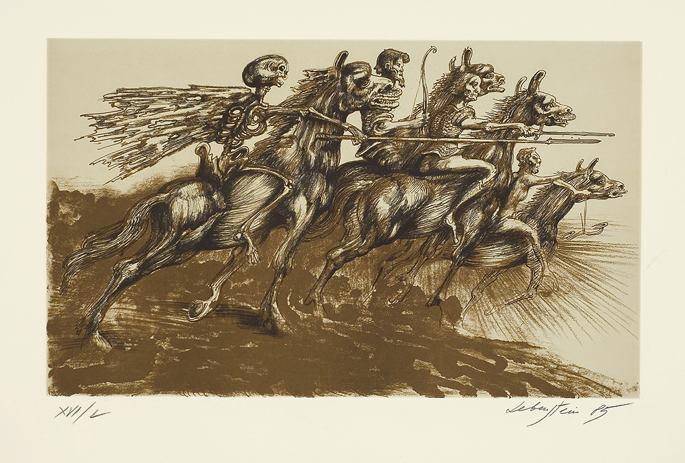 Jan Lebenstein (Brześć Litewski 1930 - Kraków 1999) w latach 1948-1954 studiował malarstwo w ASP w Warszawie pod kierunkiem prof. Eugeniusza Eibischa i Artura Nachta-Samborskiego. W 1955 wziął udział w wystawie w warszawskim Arsenale. Zaprzyjaźniony w czasie studiów z Mironem Białoszewskim, swą pierwszą wystawę indywidualną pokazał w 1956 w Teatrze na Tarczyńskiej. W 1959 zdobył Grand Prix de la Ville de Paris na I Biennale Młodych w Paryżu i w tym roku przeniósł się na stałe do Paryża. Po seriach "figur kreślonych" (na papierze milimetrowym) i "figur hieratycznych" z lat 1955-1958 maluje cykl "figur osiowych" (1958-1962), które wystawia w Paryżu i USA. Równolegle w 1960 zaczyna rysowane "karnety", rodzaj dziennika, który w przyszłości dostarczy motywów wykorzystanych w obrazach. W latach 1964-1965 maluje "Bestiarium", cykl fakturowych, archaizowanych stworów przypominających prehistoryczne wykopaliska. Bezpośrednio po nich wprowadza do swych obrazów postaci ludzkie i fantastyczne, odgrywające sceny ni to mitologiczne, ni to ze snu, często przesycone erotyką. W 1970 projektuje witraże dla Centre du Dialogue w Paryżu. W W 1971 otrzymuje obywatelstwo francuskie 1974 powstają gwasze inspirowane Folwarkiem zwierzęcym George'a Orwella. W latach 1976-1989 tworzy wyłącznie w technice gwaszu i pastelu, podejmując tematykę mitologiczną i zaczerpniętą z Biblii: cykle ilustracji do Księgi Hioba (wyd. 1979) i do Apokalipsy (wyd. 1986) w nowych przekładach Czesława Miłosza. W 1989 powraca do malarstwa olejnego (cykl "Pergamon"). Artysta otrzymał m. in. nagrodę Fundacji im. Alfreda Jurzykowskiego w 1976, Nagrodę Muzeum Archidiecezji Warszawskiej w 1985, Nagrodę im. Jana Cybisa w 1987.