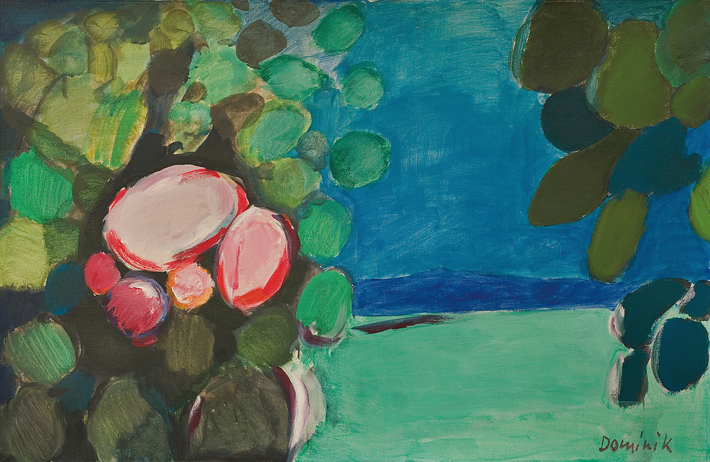 Tadeusz Dominik (Szymanów 14 I 1928 - Warszawa 20 V 2014) studiował na Wydziale Malarstwa ASP w Warszawie pod kierunkiem prof. J.Cybisa (1946-51, dyplom 1953). Od 1951 był pedagogiem na macierzystym Wydziale, początkowo jako asystent Cybisa. Od 1965 prowadził własną pracownię, w 1979 otrzymał tytuł profesora. W 1990 przeszedł na emeryturę. W czasie studiów oddziałały nań - za pośrednictwem osobowości i sztuki Cybisa - idee polskiego koloryzmu, które następnie twórczo i samodzielnie kontynuował. Początkowo tworzył obrazy figuratywne. Debiutował na słynnej wystawie w warszawskim Arsenale w 1955, gdzie zdobył nagrodę. W tym okresie obok malarstwa uprawiał drzeworyt, operujący szerokimi płaszczyznami bieli i czerni (drzeworyty wystawiał m.in. na Biennale w Wenecji w 1956). W drugiej poł. lat 50. zaczął malować obrazy abstrakcyjne, początkowo utrzymane w ekspresyjnej i spontanicznej stylistyce malarstwa informel. W latach 60. wzbogacił swe prace o efekty fakturowe. Niezmienną inspiracją była dla malarza natura, bogactwo i kolorystyka jej form. Pozostał jej wierny do dziś, poddając zmianom sam sposób malowania. Stopniowo rozjaśniał i wygładzał swe kompozycje, wprowadzając efekty dekoracyjne, jak rytmiczne powtórzenia form czy rodzaj malowanych „rastrów“, regularnie znaczących fragmenty kompozycji. Wśród wielu nagród otrzymał m.in. laur „Złotego Grona“ w Zielonej Górze w 1963, Grand Prix Festiwalu Polskiego Malarstwa Współczesnego w Szczecinie w 1968, nagrodę im. George’a Rowney’a w Londynie w 1973 i Nagrodę im. Jana Cybisa w Warszawie w 1973. Równolegle z malarstwem zajmował się gobelinem, ceramiką, również grafiką komputerową.