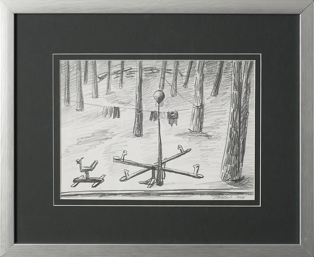 Jarosław Modzelewski (Warszawa 1955, mieszka w Warszawie) studiował malarstwo w ASP w Warszawie w latach 1975-1980, uzyskując dyplom w pracowni Stefana Gierowskiego. Od 1982 pracuje jako pedagog na macierzystym wydziale. W 1982 był współzałożycielem „Gruppy”, najważniejszego ugrupowania nurtu nowej ekspresji lat 80., działającego do 1992. W latach 1991-1996 wspólnie z Markiem Sobczykiem prowadził prywatną Szkołę Sztuki w Warszawie. Od wielu lat współpracuje z Galerią Zderzak w Krakowie. W początkowym okresie twórczości skłaniał się ku abstrakcji, wykorzystywał uproszczone znaki i emblematy oraz sylwetki odbite z szablonu. W 1985 namalował cykl oparty na ilustracjach do podręczników języka rosyjskiego, obrazujący proste czynności, których czasownikowe określenia stanowią tytuły prac. W 1986-1989 powstawały obrazy utrzymane w konwencji realistycznej, jednak zarazem o surrealnej atmosferze uzyskiwanej różnymi metodami, np. przez dublowanie figur, ukazywanie postaci w sytuacji niepewności czy zagrożenia, zabiegi z przestrzenią. W grupie obrazów z 1988 artysta rezygnuje z postaci ludzkiej na rzecz wyjątkowego nasycenia emocją samej przestrzeni pejzaży i wnętrz. Około 1990 wraca do kompozycji akcentujących czynności wykonywane przez postaci, które często umieszczone są w pustej, zaledwie zasugerowanej, acz dominującej przestrzeni. Odrealnienia i monumentalności dodaje tym obrazom płaskie i rozległe kładzenie koloru.