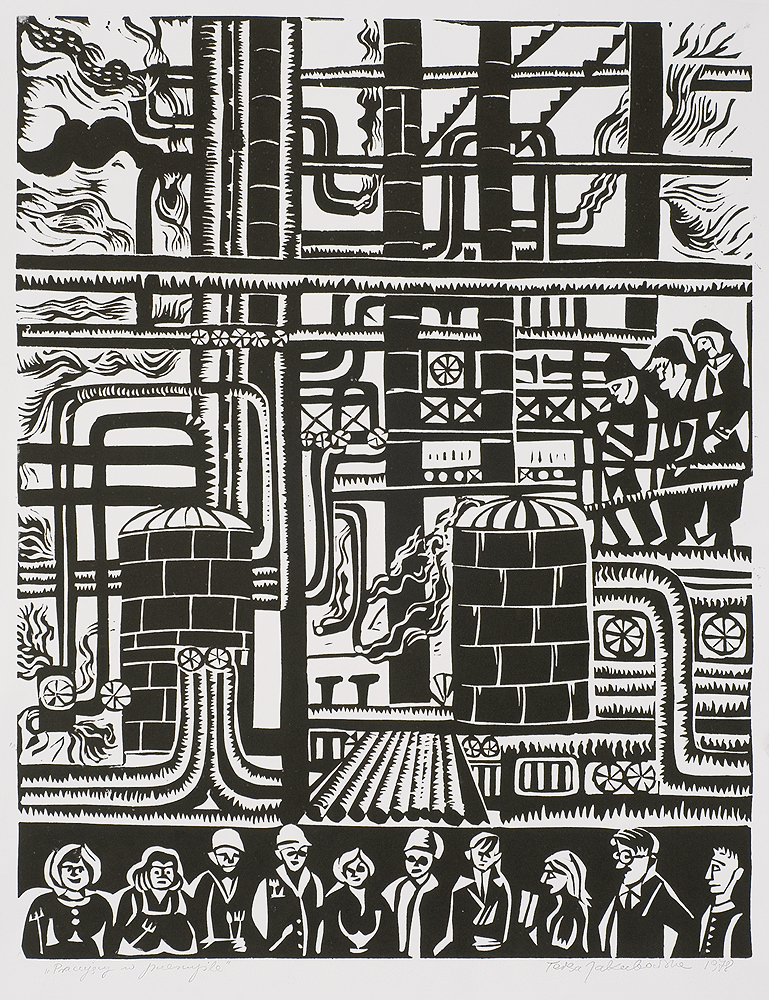 Teresa Jakubowska (ur. Wilno 22 IV 1930, mieszka w Warszawie) studiowała na Wydziale Sztuk Pięknych Uniwersytetu Mikołaja Kopernika w Toruniu (1948-1953). Członek ZPAP (1954-1983), "Grupy Toruńskiej" (1958-1969), AIAP (od 1955), Międzynarodowego Stowarzyszenia Drzeworytników XYLON w Szwajcarii (od 1978). Działała w Toruniu, od 1969 w Warszawie. Otrzymała wyróżnienia na I i II Sympozjum "Złote Grono", Zielona Góra 1963 i 1965, a także wiele nagród, medali i wyróżnień na przeglądach i w konkursach środowiskowych i graficznych. W 1963 wraz z Józefem Gielniakiem reprezentowała Polskę na paryskim Biennale Sztuki Młodych. Uprawia grafikę warsztatową w technikach wypukłych (drzeworyt, linoryt), preferując duże formaty prac. Podejmuje tematykę życia codziennego i zdarzeń dotyczących zbiorowości, widzianych często w sposób satyryczny. Jej twórczość jest reprezentowana w czołowych kolekcjach muzealnych w Polsce i za granicą.
