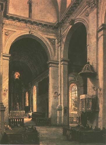 Marcin Zaleski (Kraków 1796 - Warszawa 1877) był wybitnym polskim malarzem widoków miejskich, architektury i wnętrz. Mistrzowską umiejętność malowania widoków perspektywicznych zyskał pracując w latach 1817-1822 w dekoratorni Teatru Narodowego w Warszawie, a także dzięki kopiowaniu obrazów w galerii J. Ossolińskiego i dzieł Bernarda Bellotta na Zamku Królewskim w Warszawie. W roku 1928 otrzymał złoty medal za obrazy pokazane na Warszawskiej Wystawie Sztuk Pięknych, a w 1829 stypendium rządowe, które umożliwiło mu wyjazd za granicę. Przez Niemcy pojechał najpierw do Paryża, gdzie uczył się u Pierre-Luc-Charlesa Cicéri’ego, dekoratora Opery Paryskiej, a później do Włoch. W 1830 wrócił do Warszawy. W 1846 został profesorem perspektywy w warszawskiej Szkole sztuk Pięknych. Po zamknięciu Szkoły był w latach 1865-1868 profesorem w Warszawskiej Klasie Rysunkowej. Malował, m.in. widoki Warszawy, Krakowa, Wilna, Zamościa. Malował także wnętrza – pałaców, dworów (Pałac w Łazienkach) oraz licznych kościołów w Polsce czy we Włoszech (Katedra w Mediolanie). Był również malarskim kronikarzem historii współczesnej: namalował cykl obrazów przedstawiających wypadki powstania listopadowego (Zdobycie Arsenału czy Powrót oddziałów polskich z Wierzbna). Na zamówienie rządowe stworzył też szereg widoków twierdz i miast ufortyfikowanych (Modlin, Dębno, Zamość, Bobrujsk, Brześć Litewski). W swoim malarstwie dużą rolą przykładał do roli światła, wydobywającego i modelującego kształty i grającego w miejskim pejzażu.