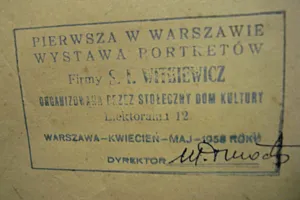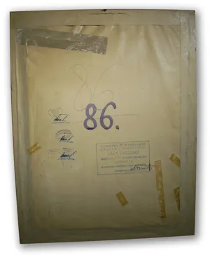 Z tyłu na papierze oprawy dwukrotnie – ołówkiem i tuszem – numer. 86 [numer katalogu TBB]. Cztery stemple wystawowe opatrzone – nieczytelnymi - podpisami : - 1./ Eksponowany na wystawie | w Nowym Targu – sierpień 1957; - 2./ stempel owalny: Eksponowany na wyst...