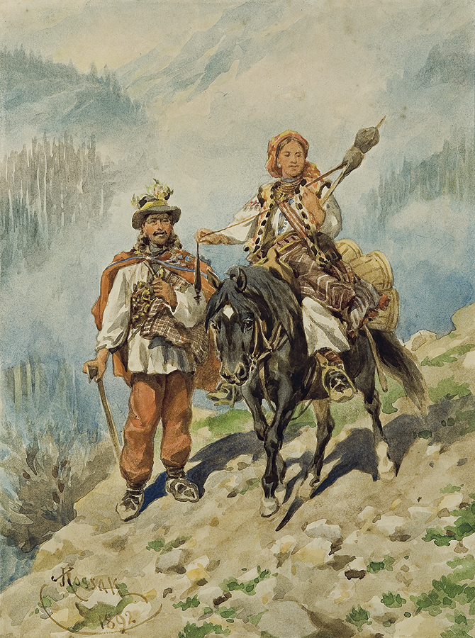 Juliusz Kossak (Wiśnicz 1824 - Kraków 1899) - malarz i ilustrator - był jednym z najpopularniejszych artystów polskich 2. połowy XIX wieku. Naukę rysunku i malarstwa rozpoczął we lwowskiej pracowni Jana Maszkowskiego; później wiele rysował z natury odwiedzając majątki szlacheckie na Ukrainie, Podolu i Wołyniu. W roku 1852 był w Wiedniu, na Węgrzech i w Petersburgu, a następnie zamieszkał na stałe w Warszawie. Lata 1856-1860 spędził w Paryżu, gdzie przyjaźnił się z Horacem Vernetem. Powróciwszy do Warszawy w latach 1862-1868 był kierownikiem artystycznym „Tygodnika Ilustrowanego”. W roku 1869 przeniósł się na stałe do Krakowa, skąd wyjeżdżał jeszcze do Monachium, by malować w atelier batalisty Franza Adama. Kossak był przede wszystkim znakomitym akwarelistą; rzadziej posługiwał się techniką olejną. Malował obrazy historyczne i batalistyczne, sceny rodzajowe ilustrujące życie i tradycje dworu szlacheckiego oraz obyczaje polskiego ludu. Ale prawdziwymi bohaterami jego obrazów były konie, których ruch, temperament, charakter i indywidualność potrafił po mistrzowsku przedstawić. Był także autorem wielu ilustracji do czasopism i książek, trafiającym bezbłędnie tak w klimat utworów literackich, jak i w tęsknoty i potrzeby odbiorców - czytelników Pieśni o ziemi naszej Wincentego Pola, Trylogii Henryka Sienkiewicza, Pana Tadeusza i poematów Adama Mickiewicza.