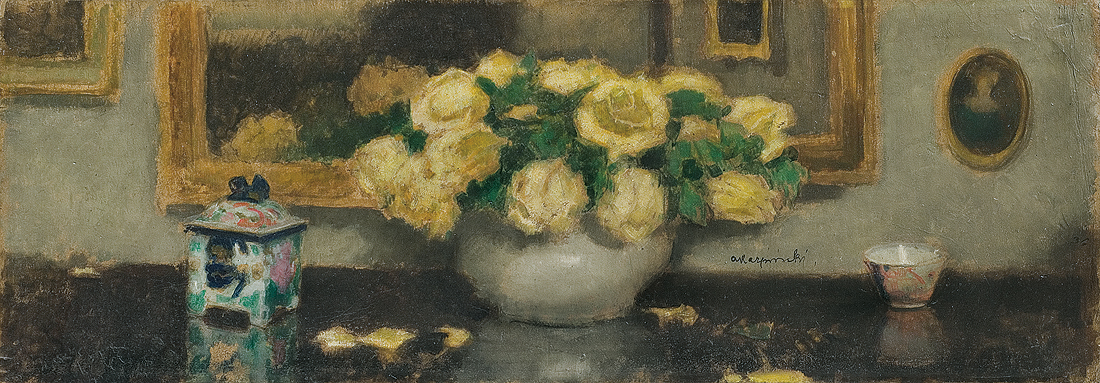 Alfons Karpiński (Rozwadów, dziś dzielnica Stalowej Woli 1875 - Kraków 1961) w latach 1891-1899 studiował w krakowskiej Szkole Sztuk Pięknych pod kierunkiem Floriana Cynka, Izydora Jabłońskiego, Władysława Łuszczkiewicza i Leona Wyczółkowskiego, a następnie kształcił się jeszcze u Antona Ažbégo w Monachium (1903), u Kazimierza Pochwalskiego w Wiedniu, a od 1907 także w Paryżu. Podróżował do Włoch i Londynu. Stale mieszkał w Krakowie; związany z tamtejszym środowiskiem skupionym wokół „Zielonego Balonika” projektował dekoracje do przedstawień kabaretu. Należał do Tow. Artystów Polskich „Sztuka”, grupy „Zero”, był członkiem wiedeńskiego stowarzyszenia „Secesja” i krakowskiego TPSP. Uczestniczył w wielu wystawach w kraju i za granicą. W czasie I wojny światowej służył w armii austriackiej. Na bogatą twórczość artysty składają się wczesne sceny rodzajowe z podkrakowskiej wsi, pejzaże i portrety, wśród nich zwłaszcza portrety kobiece, które przyniosły mu szczególną popularność. Z czasem głównym – obok portretu – tematem jego obrazów stały się martwe natury z kwiatami, dekoracyjne kompozycje o stonowanej gamie barwnej. Artysta zajmował się także grafiką i ilustratorstwem.