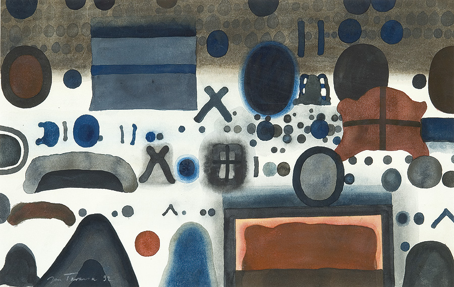 Jan Tarasin (Kalisz 11 IX 1926 - Warszawa 8 VIII 2009) studiował malarstwo w ASP w Krakowie pod kierunkiem prof. Zbigniewa Pronaszki (1946-1951). Jeszcze jako student zadebiutował na I Wystawie Sztuki Nowoczesnej w Krakowie w 1948/49. W połowie lat 50. stworzył cykle litografii: „Nowa Huta i jej mieszkańcy“, 1954, „Dom“, 1955). W pierwszym przeciwstawił się oficjalnemu optymizmowi, w drugim, operując symboliką martwej natury, zawarł treści egzystencjalne i odnoszące do niedawnego dramatu wojny. Po 1956 zaczął malować obrazy niefiguratywne. Układy wyodrębnionych elementów (określanych jako „przedmioty“) umieszczane były przez artystę na płaszczyźnie (cykl „Wnętrze“, 1957) ), lub w aluzyjnej przestrzeni (cykle „Uczta“, 1957, „Brzeg“, 1962-1964, „Przedmioty policzone“, od 1968, „Antykwariat“, 1968). Zasada ta utrzymuje się w jego malarstwie w następnych latach, różnice między okresami twórczości dotyczą sposobu opracowania „przedmiotów“ i ich usytuowania w przestrzeni obrazu lub wobec tła. Od lat 70. „przedmioty“ zmieniają się w graficzne, zwykle czarne znaki na jasnych tłach (cykl „Kolekcja“, od 1971). Tła z kolei bywają iluzyjnie przestrzenne, zróżnicowane walorowo, miękkie. W latach 90. artysta wrócił do kolorystycznego, bardziej malarskiego rozwiązywania zarówno znaków, jak i teł, często ciemnych lub przenikających się z „przedmiotami“ (cykl „Wylęgarnia przedmiotów“, 1992). Tarasin od 1962 jest członkiem „Grupy Krakowskiej“. W 1963-67 uczył na Wydziale Architektury Wnętrz krakowskiej ASP. W 1967 przeniósł się do Warszawy, w 1974 podjął pracę pedagogiczną na Wydziale Malarstwa ASP w Warszawie. W 1987-90 był rektorem tej uczelni. W 1976 otrzymał Nagrodę Krytyki Artystycznej im. Cypriana Kamila Norwida, w 1984 Nagrodę im. Jana Cybisa.; Nagroda na MB Sztuki w San Marino 1965. Równolegle z malarstwem zajmował się rysunkiem i grafiką - do lat 60. litografią, od 1974 serigrafią. W 1974-1981 wydał 8 autorskich „Zeszytów“ z serigrafiami i własnymi tekstami. W 1995 w Galerii Zachęta odbyła się wystawa artysty, której towarzyszył monograficzny katalog.