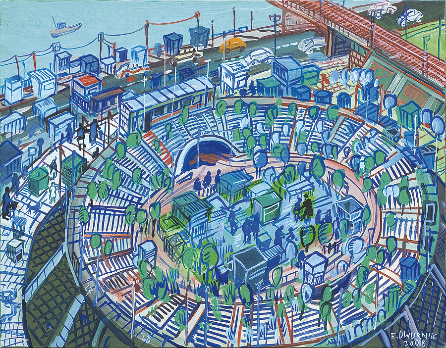 Edward Dwurnik (Radzymin 19 IV 1943 - Warszawa 28 X 2018) studiował malarstwo w ASP w Warszawie (1963-1970), jednak jako swego „mistrza“ wymienia Nikifora. Jego to prace, zobaczone po raz pierwszy w 1965, zainspirowały ówczesnego studenta III roku do narysowania pierwszych prac z cyklu „Podróże autostopem“, które kontynuował w nastepnych latach. W 1972-1978 powstawał cykl „Sportowcy“, w którym portretowane były, dodajmy - kąśliwie, typowe postaci z lat 70. Równolegle od 1975 powstawał cykl „Robotnicy“, który kulminował w okresie „Solidarności“ 1980-1981. Za prace z tego cyklu Dwurnik otrzymał w 1981 Nagrodę Krytyki Artystycznej im. Cypriana Kamila Norwida, natomiast za obrazy z cyklu „Warszawa“ (1981), proroczo zapowiadające stan wojenny - Nagrodę Kulturalną „Solidarności“ podziemnej w 1983. W latach 80. malarstwo Dwurnika przybrało wyraz ekspresyjny i dramatyczny. Powstające w tej dekadzie obrazy miały niejednokrotnie wymowę polityczną, przybierały też kostium historyczny, tak czy inaczej odnoszący się do współczesnych spraw i realiów. Cykl „Droga na Wschód“ (1989-91) upamiętniał ofiary stalinizmu, natomiast cykl „Od Grudnia do Czerwca“ (1990-94) - ofiary stanu wojennego. Zarówno ideowe, jak i czysto malarskie walory tych prac przyniosły artyście ogromne uznanie, zarówno w kraju jak i za granicą. Jego wyrazem była prestiżowa nagroda Fundacji Coutts & Co w Zurychu (1992). W latach 90. powstają cykle będące kontynuacją „Podróży autostopem“: „Niebieskie miasta“ (od 1993) i „Diagonale“ (od 1996), jak również kompozycje nowego typu, jak widoki morskie (cykl „Błękitne“, 1992-93) czy cykl „Wyliczanka“ (1996-99). Artysta wiele wystawia, miał ok. 100 wystaw indywidualnych w Polsce i za granicą, brał też udział w licznych wystawach i festiwalach krajowych i międzynarodowych, m.in.: X Biennale Sztuki Współczesnej, Menton 1974, Documenta 7, Kassel 1982, 5th Biennale, Sydney 1985, XIX Biennale Sztuki, Sao Paulo 1987; Olimpiada Sztuki, Seul 1988. Równolegle z malarstwem uprawiał rysunek, collage, grafikę warsztatową (litografia, techniki metalowe, kserografia, stemple) i użytkową (ilustracja, plakaty do własnych wystaw indywidualnych).