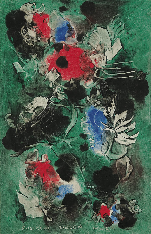 Alfred Lenica (Pabianice 1899 - Warszawa 1977) uczył się prywatnie rysunku i malarstwa w pracowniach Artura Hannytkiewicza i Piotra Kubowicza w Poznaniu (1925-1928). W latach 30. malował obrazy figuratywne, nawiązujące w stylistyce do kubizmu. Nieco później uległ wpływom surrealizmu, który, pomijając lata socrealizmu, stanie się dlań najpoważniejszym obszarem poszukiwań malarskich. Od połowy lat 40. utrzymywał stałe kontakty z kręgiem „Grupy Krakowskiej“, przyjaźnił się z Jerzym Kujawskim. Po przeniesieniu się do Poznania, w 1947 został współzałożycielem awangardowej grupy „4F+R“ (farba, forma, fantastyka, faktura + realizm). Jest autorem pierwszego polskiego obrazu taszystowskiego (Farby w ruchu, 1949, tempera). W okresie socrealizmu włączył się w nurt oficjalnej sztuki, pracując jednocześnie jako organizator życia artystycznego, prezes Okręgu Poznańskiego ZPAP (1948-1950) i jednocześnie kierownik Pracowni Sztuk Plastycznych tamże. W końcu lat 50. przeniósł się do Warszawy i również tu do 1969 pełnił kierownicze funkcje w ZPAP. W drugiej poł. lat 50. ponownie - po eksperymentach z lat 40. - uprawiał informel, malując chętnie techniką drippingu. Około 1958 wypracował indywidualny, charakterystyczny dlań styl wirujących, kolorowych, niekiedy kaligraficznie opracowanych form, które dynamicznie wypełniały pola obrazów. Tworzył je techniką zbliżoną do surrealistycznej dekalkomanii. Styl ten stał się znakiem rozpoznawczym artysty do końca życia. W swych obrazach nie unikał kształtów nawiązujących do form naturalnych (jego malarstwo nazywano „biologicznym“), a w latach 70. niekiedy włączał do kompozycji motywy figuralne. Wystawa retrospektywna artysty odbyła się w Galerii Zachęta w Warszawie w 1974.