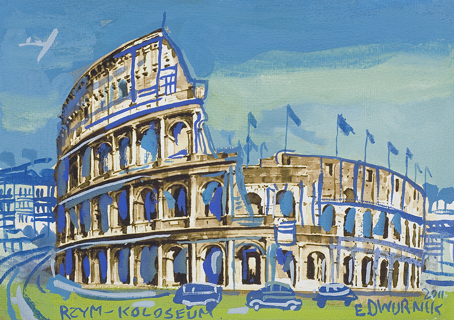 Edward Dwurnik (Radzymin 19 IV 1943 - Warszawa 28 X 2018) studiował malarstwo w ASP w Warszawie (1963-1970), jednak jako swego „mistrza“ wymienia Nikifora. Jego to prace, zobaczone po raz pierwszy w 1965, zainspirowały ówczesnego studenta III roku do narysowania pierwszych prac z cyklu „Podróże autostopem“, które kontynuował w nastepnych latach. W 1972-1978 powstawał cykl „Sportowcy“, w którym portretowane były, dodajmy - kąśliwie, typowe postaci z lat 70. Równolegle od 1975 powstawał cykl „Robotnicy“, który kulminował w okresie „Solidarności“ 1980-1981. Za prace z tego cyklu Dwurnik otrzymał w 1981 Nagrodę Krytyki Artystycznej im. Cypriana Kamila Norwida, natomiast za obrazy z cyklu „Warszawa“ (1981), proroczo zapowiadające stan wojenny - Nagrodę Kulturalną „Solidarności“ podziemnej w 1983. W latach 80. malarstwo Dwurnika przybrało wyraz ekspresyjny i dramatyczny. Powstające w tej dekadzie obrazy miały niejednokrotnie wymowę polityczną, przybierały też kostium historyczny, tak czy inaczej odnoszący się do współczesnych spraw i realiów. Cykl „Droga na Wschód“ (1989-91) upamiętniał ofiary stalinizmu, natomiast cykl „Od Grudnia do Czerwca“ (1990-94) - ofiary stanu wojennego. Zarówno ideowe, jak i czysto malarskie walory tych prac przyniosły artyście ogromne uznanie, zarówno w kraju jak i za granicą. Jego wyrazem była prestiżowa nagroda Fundacji Coutts & Co w Zurychu (1992). W latach 90. powstają cykle będące kontynuacją „Podróży autostopem“: „Niebieskie miasta“ (od 1993) i „Diagonale“ (od 1996), jak również kompozycje nowego typu, jak widoki morskie (cykl „Błękitne“, 1992-93) czy cykl „Wyliczanka“ (1996-99). Artysta wiele wystawia, miał ok. 100 wystaw indywidualnych w Polsce i za granicą, brał też udział w licznych wystawach i festiwalach krajowych i międzynarodowych, m.in.: X Biennale Sztuki Współczesnej, Menton 1974, Documenta 7, Kassel 1982, 5th Biennale, Sydney 1985, XIX Biennale Sztuki, Sao Paulo 1987; Olimpiada Sztuki, Seul 1988. Równolegle z malarstwem uprawiał rysunek, collage, grafikę warsztatową (litografia, techniki metalowe, kserografia, stemple) i użytkową (ilustracja, plakaty do własnych wystaw indywidualnych).