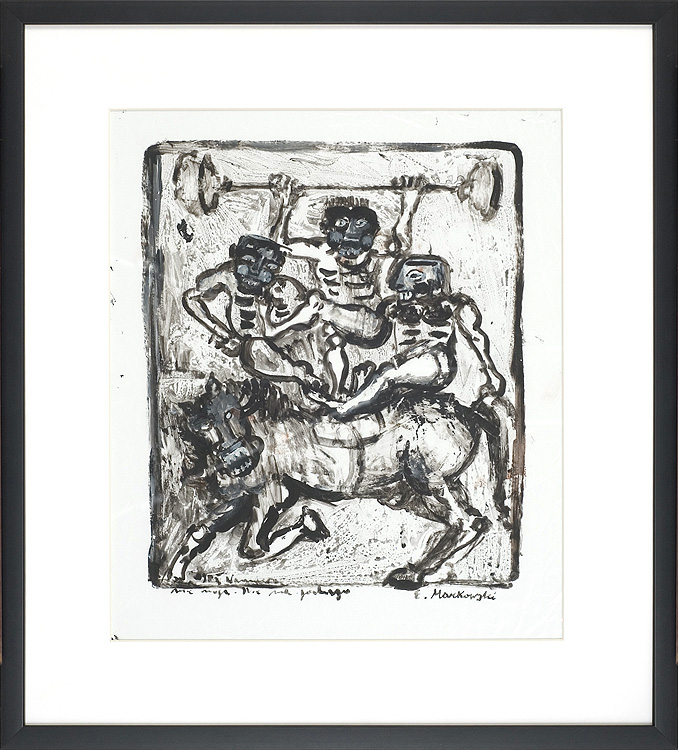 Eugeniusz Markowski (Warszawa 8 XI 1912 - Warszawa 24 II 2007) studiował w warszawskiej ASP, dyplom u prof. Tadeusza Pruszkowskiego uzyskał w 1939. Brał udział w kampanii wrześniowej i obronie Warszawy. W latach 1940-1950 przebywał we Włoszech, gdzie związał się z grupą Libera Associazione Arti Figurative i z Art Club w Rzymie. Zajmował się też projektowaniem scenografii dla rzymskiego Teatro delle Arti. Był dziennikarzem i dyplomatą we Włoszech i Kanadzie (1945-1955). Po powrocie do kraju był dyrektorem Biura Współpracy Kulturalnej z Zagranicą Ministerstwa Kultury i Sztuki (1960-1969), następnie wykładowcą i profesorem ASP w Warszawie (1969-1984). Współ-pracował jako scenograf z Operą Gdańską i teatrami warszawskimi. W 1963 reprezentował Polskę na Biennale w Sao Paulo, miał kilka wystaw indywidualnych. Jego ekspresyjny styl malowania, bezpośredniość i pewna rubaszność figuratywnych przedstawień walk i zmagań spowodowały, że w latach 80. uznano go za prekursora „nowodzikich".