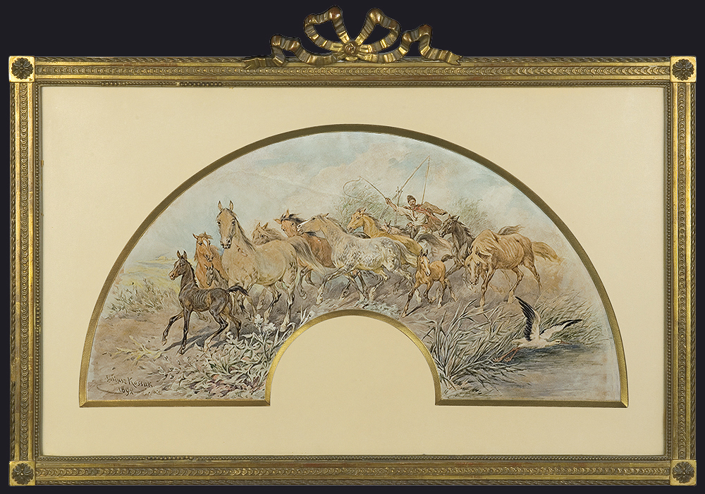 Juliusz Kossak (Wiśnicz 1824 - Kraków 1899) - malarz i ilustrator - był jednym z najpopularniejszych artystów polskich 2. połowy XIX wieku. Naukę rysunku i malarstwa rozpoczął we lwowskiej pracowni Jana Maszkowskiego; później wiele rysował z natury odwiedzając majątki szlacheckie na Ukrainie, Podolu i Wołyniu. W roku 1852 był w Wiedniu, na Węgrzech i w Petersburgu, a następnie zamieszkał na stałe w Warszawie. Lata 1856-1860 spędził w Paryżu, gdzie przyjaźnił się z Horacem Vernetem. Powróciwszy do Warszawy w latach 1862-1868 był kierownikiem artystycznym „Tygodnika Ilustrowanego”. W roku 1869 przeniósł się na stałe do Krakowa, skąd wyjeżdżał jeszcze do Monachium, by malować w atelier batalisty Franza Adama. Kossak był przede wszystkim znakomitym akwarelistą; rzadziej posługiwał się techniką olejną. Malował obrazy historyczne i batalistyczne, sceny rodzajowe ilustrujące życie i tradycje dworu szlacheckiego oraz obyczaje polskiego ludu. Ale prawdziwymi bohaterami jego obrazów były konie, których ruch, temperament, charakter i indywidualność potrafił po mistrzowsku przedstawić. Był także autorem wielu ilustracji do czasopism i książek, trafiającym bezbłędnie tak w klimat utworów literackich, jak i w tęsknoty i potrzeby odbiorców - czytelników Pieśni o ziemi naszej Wincentego Pola, Trylogii Henryka Sienkiewicza, Pana Tadeusza i poematów Adama Mickiewicza.