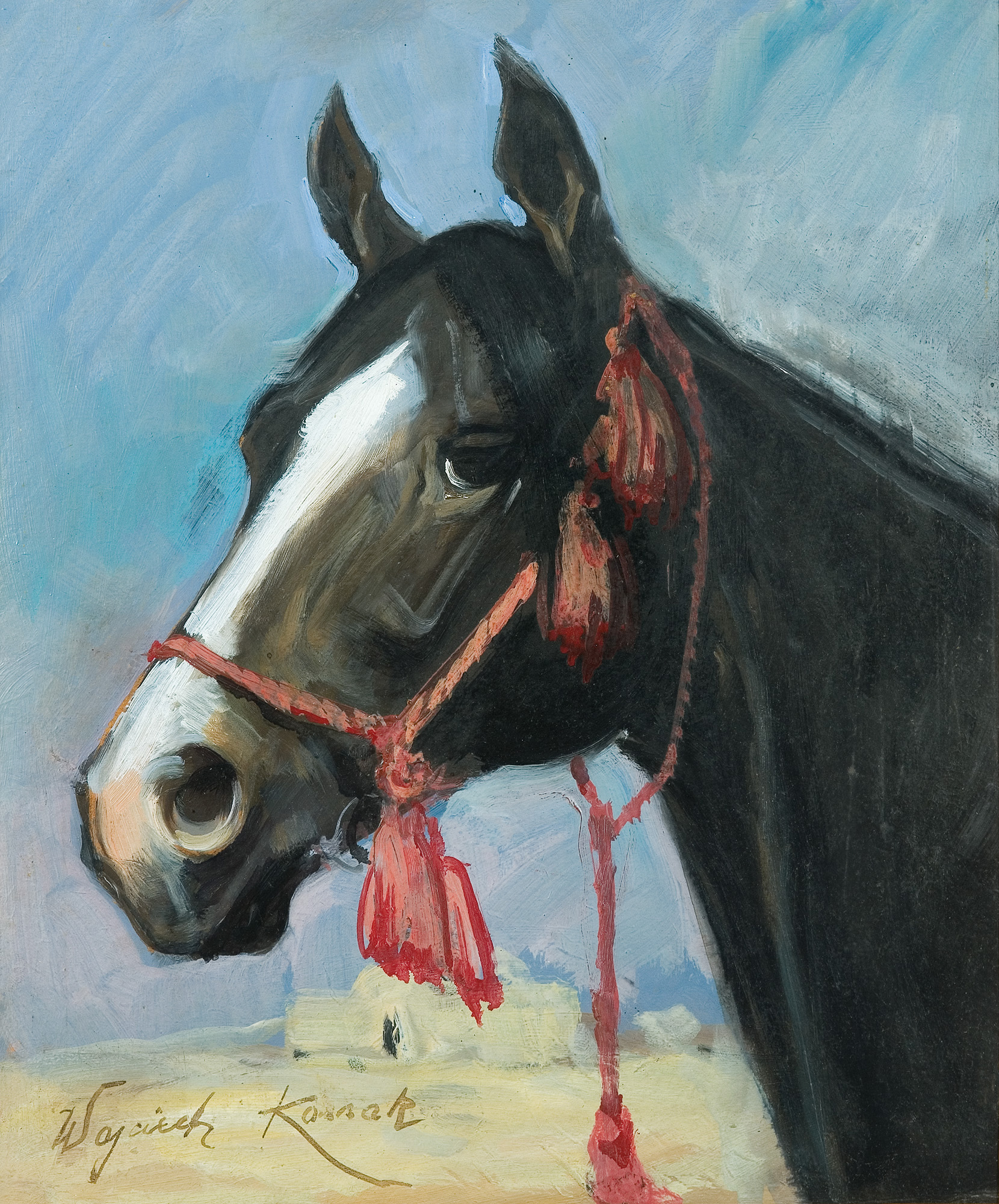 Wojciech Kossak (Paryż 1856 - Kraków 1942 ) – powszechnie znany malarz, postrzegany przede wszystkim jako świetny batalista. Syn i uczeń Juliusza Kossaka kształcił się w krakowskiej Szkole Sztuk Pięknych, w Akademii monachijskiej oraz w Paryżu. W latach 1895-1902 przebywał głównie w Berlinie, pracując dla cesarza Wilhelma II. Wiele podróżował, m.in. do Hiszpanii i Egiptu, gdzie wykonywał szkice do zamierzonych panoram. W późniejszych latach kilkakrotnie wyjeżdżał do Stanów Zjednoczonych wykonując zamówienia portretowe. W 1913 był mianowany profesorem warszawskiej Szkoły Sztuk Pięknych. W latach I wojny światowej pełnił służbę wojskową. Był współautorem panoram: „Racławice” (1893-1894), „Berezyna” (1895-1896), „Bitwa pod piramidami” (1901) oraz szkiców do niezrealizowanej „Somosierry” (1900). Z temperamentem i swobodą tworzył szeroko malowane, dynamiczne sceny batalistyczne, historyczne, rodzajowe oraz liczne portrety. Z upodobaniem malował konie. Jego obrazy, gloryfikujące dawne i współczesne artyście polskie wojsko i bohaterstwo żołnierzy, trafiały do patriotycznych uczuć odbiorców i cieszyły się ogromna popularnością.
