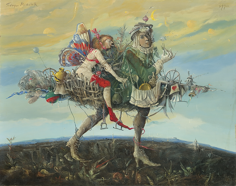 Tadeusz Michaluk (Lwów 1938, mieszka w Paryżu) - grafik, rysownik, malarz. Na początku lat 70. XX wieku zasłynął jako projektant kilku serii polskich znaczków wydanych przez Ministerstwo Łączności, autor plakatów oraz ilustrator książek. Z czasem poświęcił się głównie malarstwu. Na początku lat 80. przebywał w Sztokholmie, gdzie miał wystawę obrazów, od roku 1985 mieszkał we Francji. Na paryskiej wystawie „Le Salon 87”zdobył srebrny medal i został przyjęty do Związku Artystów Francuskich. Malarstwo jego jest swoistą interpretacją świata zbudowanego z symboliczno-metaforycznych znaczeń, zabarwionego dużą dozą groteski. Obrazy charakteryzuje ciekawa, niebanalna kompozycja i finezyjne modulowanie kolorem.
