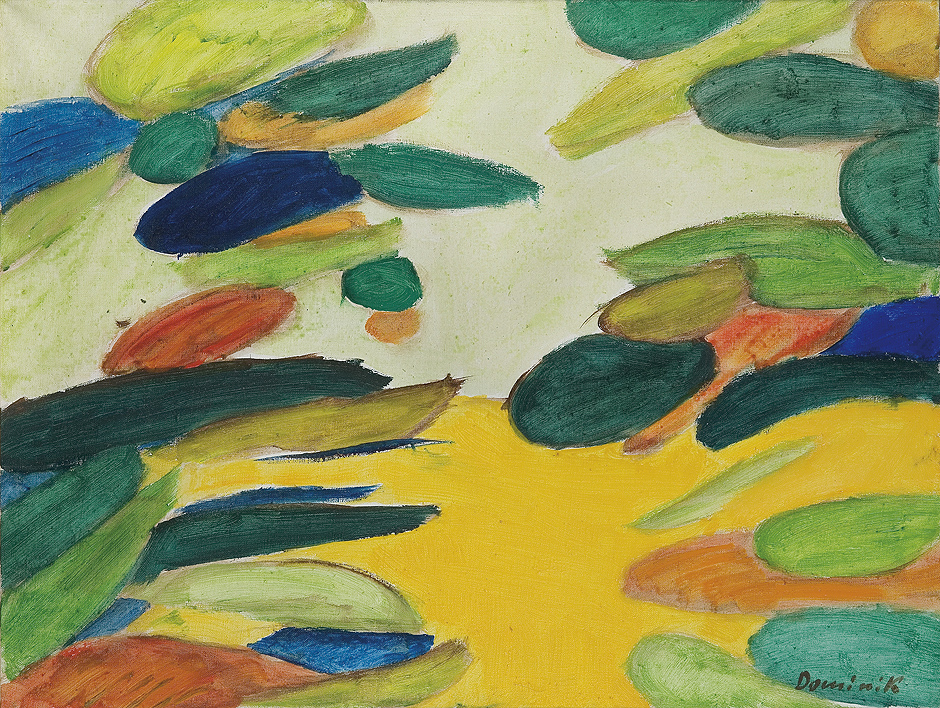 Tadeusz Dominik (Szymanów 14 I 1928 - Warszawa 20 V 2014) studiował na Wydziale Malarstwa ASP w Warszawie pod kierunkiem prof. J.Cybisa (1946-51, dyplom 1953). Od 1951 był pedagogiem na macierzystym Wydziale, początkowo jako asystent Cybisa. Od 1965 prowadził własną pracownię, w 1979 otrzymał tytuł profesora. W 1990 przeszedł na emeryturę. W czasie studiów oddziałały nań - za pośrednictwem osobowości i sztuki Cybisa - idee polskiego koloryzmu, które następnie twórczo i samodzielnie kontynuował. Początkowo tworzył obrazy figuratywne. Debiutował na słynnej wystawie w warszawskim Arsenale w 1955, gdzie zdobył nagrodę. W tym okresie obok malarstwa uprawiał drzeworyt, operujący szerokimi płaszczyznami bieli i czerni (drzeworyty wystawiał m.in. na Biennale w Wenecji w 1956). W drugiej poł. lat 50. zaczął malować obrazy abstrakcyjne, początkowo utrzymane w ekspresyjnej i spontanicznej stylistyce malarstwa informel. W latach 60. wzbogacił swe prace o efekty fakturowe. Niezmienną inspiracją była dla malarza natura, bogactwo i kolorystyka jej form. Pozostał jej wierny do dziś, poddając zmianom sam sposób malowania. Stopniowo rozjaśniał i wygładzał swe kompozycje, wprowadzając efekty dekoracyjne, jak rytmiczne powtórzenia form czy rodzaj malowanych „rastrów“, regularnie znaczących fragmenty kompozycji. Wśród wielu nagród otrzymał m.in. laur „Złotego Grona“ w Zielonej Górze w 1963, Grand Prix Festiwalu Polskiego Malarstwa Współczesnego w Szczecinie w 1968, nagrodę im. George’a Rowney’a w Londynie w 1973 i Nagrodę im. Jana Cybisa w Warszawie w 1973. Równolegle z malarstwem zajmował się gobelinem, ceramiką, również grafiką komputerową.