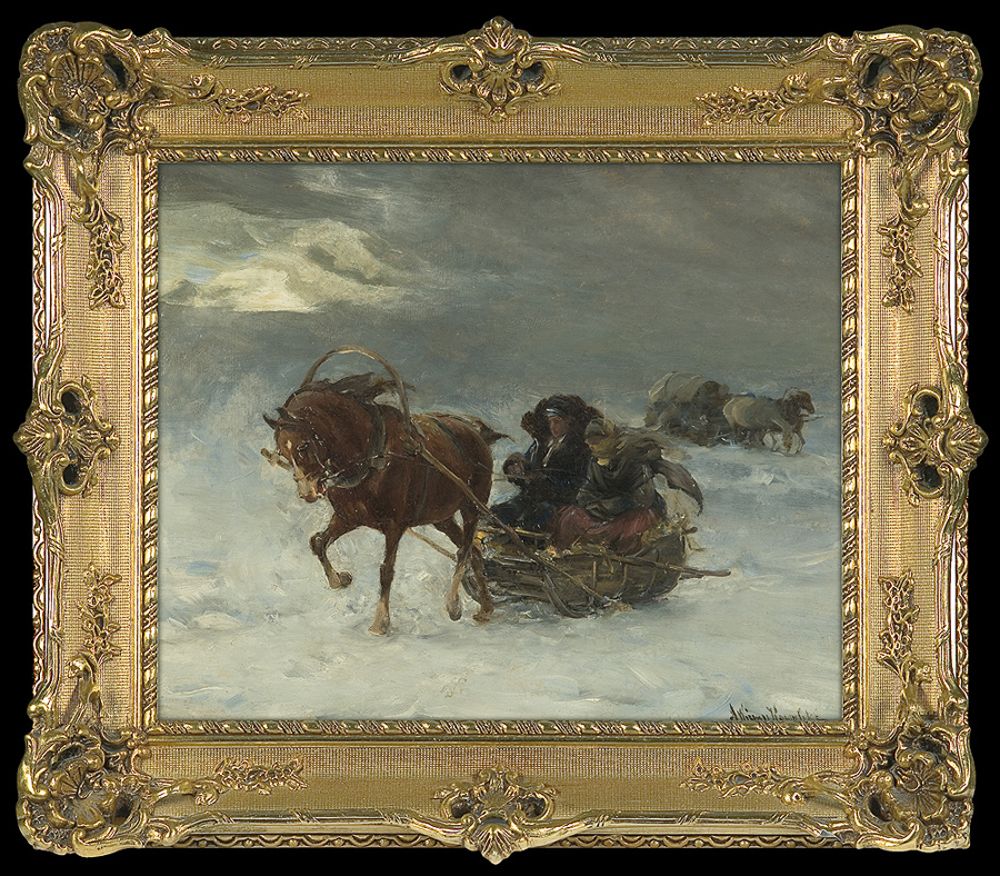 Alfred Wierusz-Kowalski (Suwałki 1849 – Monachium 1915) - jeden z najwybitniejszych polskich malarzy tzw. szkoły monachijskiej był, obok Józefa Brandta i Władysława Czachórskiego, także najpopularniejszym z polskich artystów osiadłych i stale działających w Monachium. Zamieszkał tam w roku 1873, już po studiach w Warszawie i w Dreźnie. Przez rok uczył się jeszcze w monachijskiej Akademii Sztuk Pięknych pod kierunkiem Alexandra Wagnera, a następnie przeniósł się do prywatnej pracowni Brandta. Uznanie krytyki i publiczności zdobył wcześnie; jego obrazy, odznaczane medalami na wystawach były rozchwytywane przez kolekcjonerów i niemieckich handlarzy. W roku 1890 został honorowym profesorem Akademii monachijskiej. Malował sceny rodzajowe i rodzajowo-historyczne z motywami jeźdźców, rycerzy, myśliwych, koni, wilków i śniegów. Po podróży do Afryki w roku 1903 podejmował też tematy orientalne. W polskich zbiorach muzealnych znalazło się stosunkowo niewiele prac artysty – jego obrazy sprzedawane głównie na rynku niemieckim w większej liczbie trafiały do kolekcji prywatnych, głównie w Niemczech i Stanach Zjednoczonych. Obecne często pojawiają się i na polskim rynku sztuki, zawsze budząc zainteresowanie kolekcjonerów.