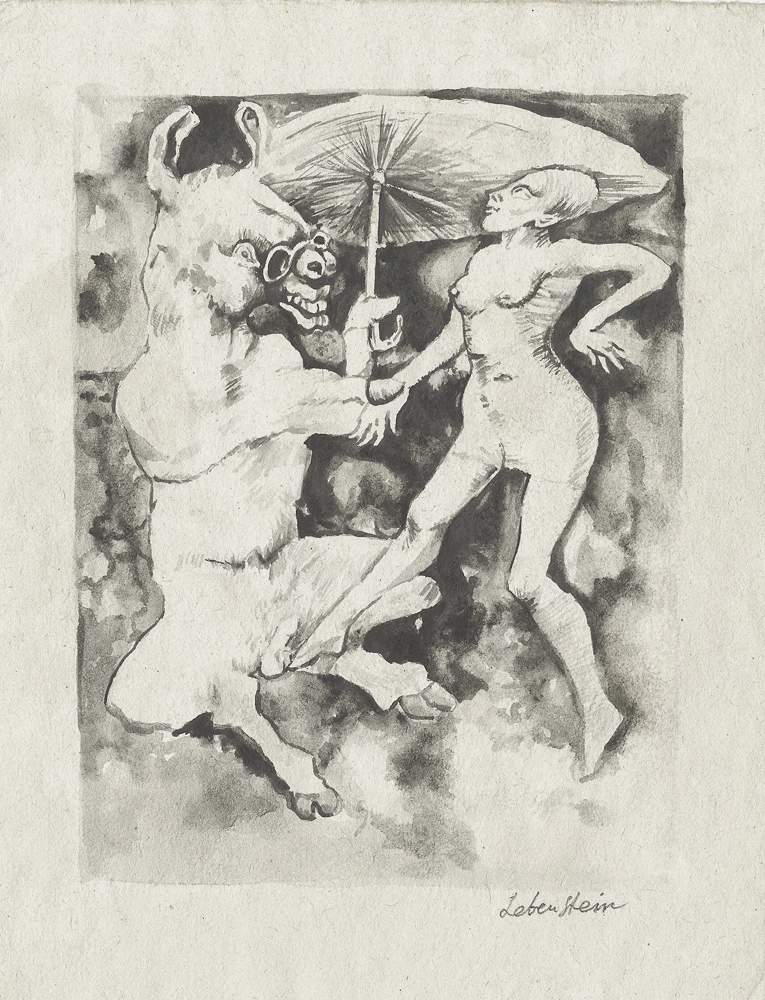 Jan Lebenstein (Brześć Litewski 1930 - Kraków 1999) w latach 1948-1954 studiował malarstwo w ASP w Warszawie pod kierunkiem prof. Eugeniusza Eibischa i Artura Nachta-Samborskiego. W 1955 wziął udział w wystawie w warszawskim Arsenale. Zaprzyjaźniony w czasie studiów z Mironem Białoszewskim, swą pierwszą wystawę indywidualną pokazał w 1956 w Teatrze na Tarczyńskiej. W 1959 zdobył Grand Prix de la Ville de Paris na I Biennale Młodych w Paryżu i w tym roku przeniósł się na stałe do Paryża. Po seriach "figur kreślonych" (na papierze milimetrowym) i "figur hieratycznych" z lat 1955-1958 maluje cykl "figur osiowych" (1958-1962), które wystawia w Paryżu i USA. Równolegle w 1960 zaczyna rysowane "karnety", rodzaj dziennika, który w przyszłości dostarczy motywów wykorzystanych w obrazach. W latach 1964-1965 maluje "Bestiarium", cykl fakturowych, archaizowanych stworów przypominających prehistoryczne wykopaliska. Bezpośrednio po nich wprowadza do swych obrazów postaci ludzkie i fantastyczne, odgrywające sceny ni to mitologiczne, ni to ze snu, często przesycone erotyką. W 1970 projektuje witraże dla Centre du Dialogue w Paryżu. W W 1971 otrzymuje obywatelstwo francuskie 1974 powstają gwasze inspirowane Folwarkiem zwierzęcym George'a Orwella. W latach 1976-1989 tworzy wyłącznie w technice gwaszu i pastelu, podejmując tematykę mitologiczną i zaczerpniętą z Biblii: cykle ilustracji do Księgi Hioba (wyd. 1979) i do Apokalipsy (wyd. 1986) w nowych przekładach Czesława Miłosza. W 1989 powraca do malarstwa olejnego (cykl "Pergamon"). Artysta otrzymał m. in. nagrodę Fundacji im. Alfreda Jurzykowskiego w 1976, Nagrodę Muzeum Archidiecezji Warszawskiej w 1985, Nagrodę im. Jana Cybisa w 1987.