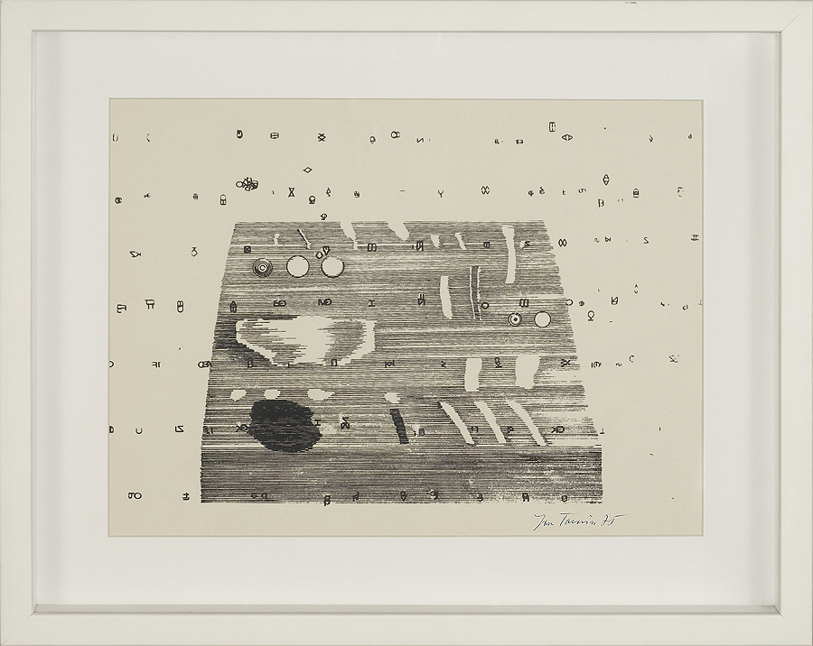 Jan Tarasin (Kalisz 11 IX 1926 - Warszawa 8 VIII 2009) studiował malarstwo w ASP w Krakowie pod kierunkiem prof. Zbigniewa Pronaszki (1946-1951). Jeszcze jako student zadebiutował na I Wystawie Sztuki Nowoczesnej w Krakowie w 1948/49. W połowie lat 50. stworzył cykle litografii: „Nowa Huta i jej mieszkańcy“, 1954, „Dom“, 1955). W pierwszym przeciwstawił się oficjalnemu optymizmowi, w drugim, operując symboliką martwej natury, zawarł treści egzystencjalne i odnoszące do niedawnego dramatu wojny. Po 1956 zaczął malować obrazy niefiguratywne. Układy wyodrębnionych elementów (określanych jako „przedmioty“) umieszczane były przez artystę na płaszczyźnie (cykl „Wnętrze“, 1957) ), lub w aluzyjnej przestrzeni (cykle „Uczta“, 1957, „Brzeg“, 1962-1964, „Przedmioty policzone“, od 1968, „Antykwariat“, 1968). Zasada ta utrzymuje się w jego malarstwie w następnych latach, różnice między okresami twórczości dotyczą sposobu opracowania „przedmiotów“ i ich usytuowania w przestrzeni obrazu lub wobec tła. Od lat 70. „przedmioty“ zmieniają się w graficzne, zwykle czarne znaki na jasnych tłach (cykl „Kolekcja“, od 1971). Tła z kolei bywają iluzyjnie przestrzenne, zróżnicowane walorowo, miękkie. W latach 90. artysta wrócił do kolorystycznego, bardziej malarskiego rozwiązywania zarówno znaków, jak i teł, często ciemnych lub przenikających się z „przedmiotami“ (cykl „Wylęgarnia przedmiotów“, 1992). Tarasin od 1962 jest członkiem „Grupy Krakowskiej“. W 1963-67 uczył na Wydziale Architektury Wnętrz krakowskiej ASP. W 1967 przeniósł się do Warszawy, w 1974 podjął pracę pedagogiczną na Wydziale Malarstwa ASP w Warszawie. W 1987-90 był rektorem tej uczelni. W 1976 otrzymał Nagrodę Krytyki Artystycznej im. Cypriana Kamila Norwida, w 1984 Nagrodę im. Jana Cybisa.; Nagroda na MB Sztuki w San Marino 1965. Równolegle z malarstwem zajmował się rysunkiem i grafiką - do lat 60. litografią, od 1974 serigrafią. W 1974-1981 wydał 8 autorskich „Zeszytów“ z serigrafiami i własnymi tekstami. W 1995 w Galerii Zachęta odbyła się wystawa artysty, której towarzyszył monograficzny katalog.